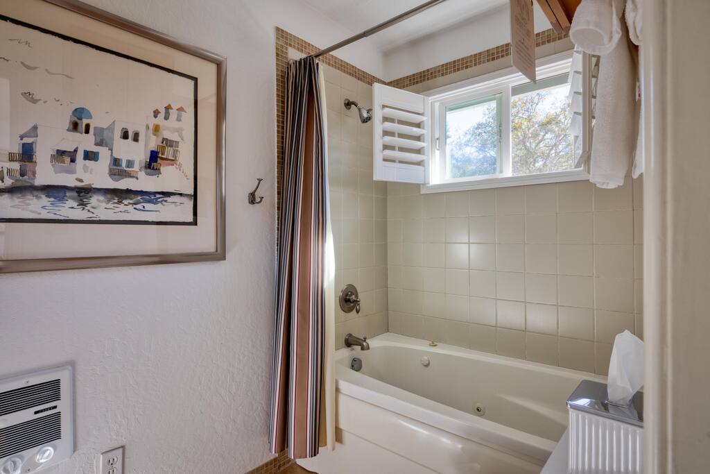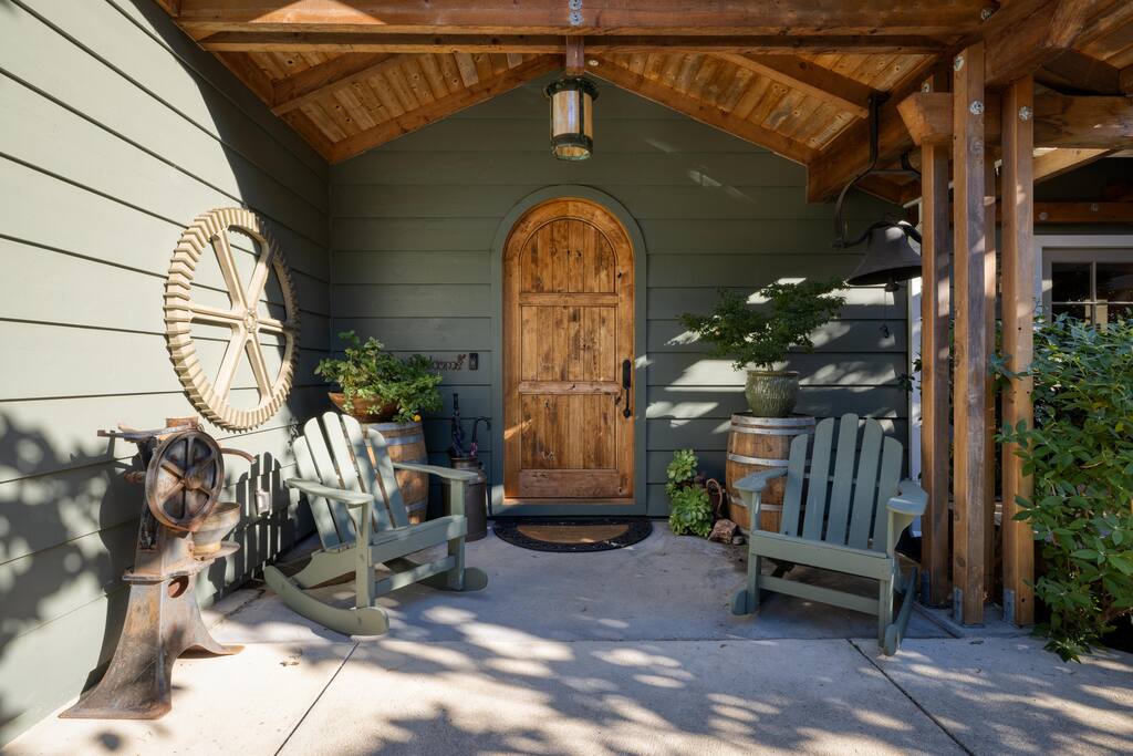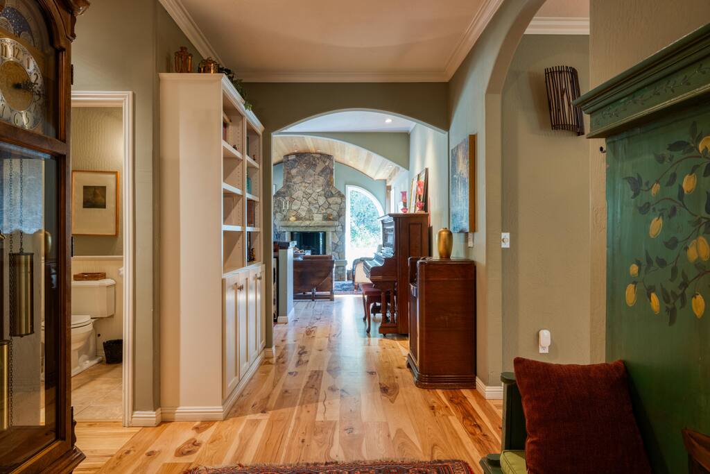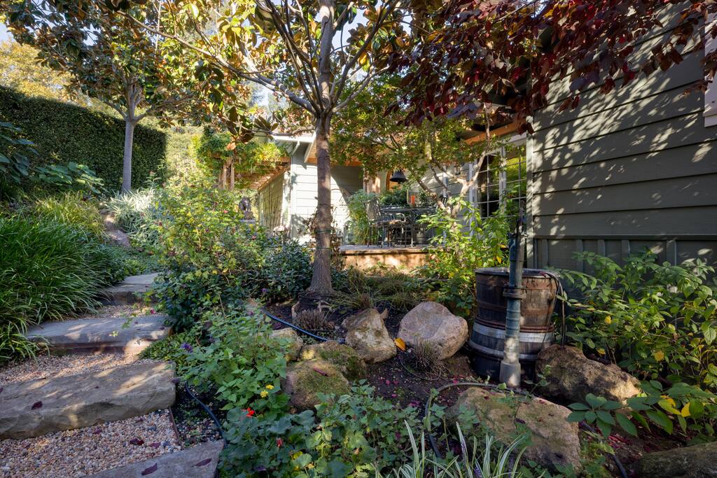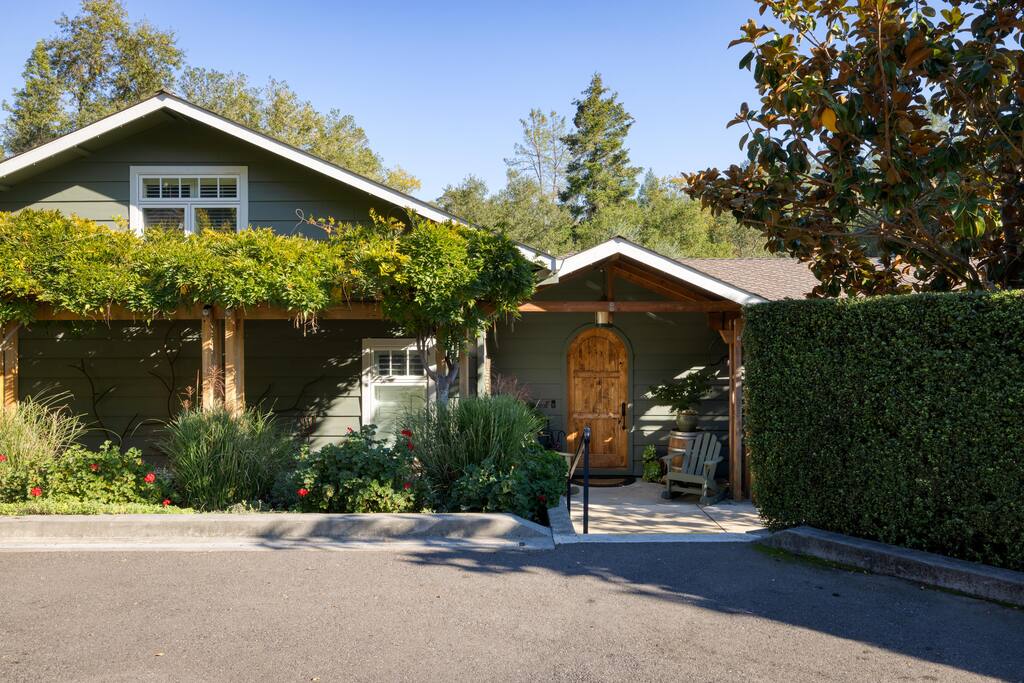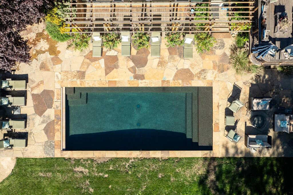 Situated on 2 acres, step into the enchanting Barrel House gardens where you will be greeted by the sight of lush greenery, vibrant flowers, and charming arbors clothed in wisteria and roses. Spend your mornings basking in the sunshine as you sip your coffee surrounded by nature's beauty. Take leisurely strolls through the well-manicured pathways, or find a cozy spot to unwind with a good book. As you venture further, you'll discover the centerpiece of our oasis—a magnificent pool where you can cool off, swim laps, or simply float aimlessly while soaking up the warm rays of the wine country sunshine. Slide into the crystal-clear waters and let the cares of the world drift away. For the ultimate relaxation, immerse yourself in the soothing bubbles of the hot tub, where your worries will melt away under the starlit sky. Step inside the charming Barrel House and prepare to be captivated by the grandeur of the huge stone fireplace that takes center stage in the living area. Whether you're gathering around for a cozy evening with loved ones or simply enjoying its mesmerizing glow, this fireplace provides a touch of warmth and charm that's second to none. The interior of our Barrel House exudes comfort and style with tasteful wine country décor and thoughtful touches throughout. The spacious bedrooms offer serene retreats, where you can rejuvenate after a day of exploration or relaxation. The fully equipped chef's kitchen beckons to the culinary enthusiast, encouraging the creation of delicious meals to be savored in the inviting dining area. In addition to the breathtaking amenities, our location is an ideal hub for adventure. Explore nearby hiking trails, discover charming local shops, or indulge in culinary delights at the finest restaurants in town. Whether you seek outdoor excursions or prefer the comforts of your private paradise, this Barrel House caters to your every desire. Experience a stay like no other at our extraordinary Barrel House. Book now and let the pool, hot tub, garden, arbors, and magnificent stone fireplace weave together an unforgettable tapestry of memories for you and your loved ones. Barrel House has TWO internet networks! Carriers are AT&T and Starlink. Other info to note: Guests are welcome to use the Tesla Charger located in the driveway. Whole house generator will automatically turn on during a power outage. Fireplace is gas, no wood necessary. 12 cup Drip coffee maker, bean grinder and electric tea kettle available for guest use (coffee not supplied) Pool is heated via solar during summer months. Winter heating is possible, additional fees apply. Property has a small gym above the garage equipped with weights, rower, treadmill, stationary bike plus a Queen Murphy bed, Toilet, sink, Shower and small kitchenette. Barrel House welcomes you with beautiful hickory wood floors, a spacious living room with coved redwood ceiling and massive stone fireplace, a large dining room, and fully-equipped gourmet, wine country kitchen with table service for 12+. French doors open to a large redwood deck with views of Dry Creek Valley and hillside vineyards. Broad steps lead down to an 8-person hot tub, spectacular salt water swimming pool, spacious lawns, shaded grape and wisteria gazebo and a seasonal creek. On the main floor, you’ll find the living room with large wet bar, dining room, kitchen and two large bedrooms furnished with king sized beds. Picture windows in each bedroom overlook the Barrel House vineyards, pool and grounds. The main floor also has two full baths, a powder room and laundry available. Stairs to the lower floor lead to the family room with wet bar and large flat-screen TV, a full bathroom and a third bedroom with a queen sized bed plus 2 twin beds.