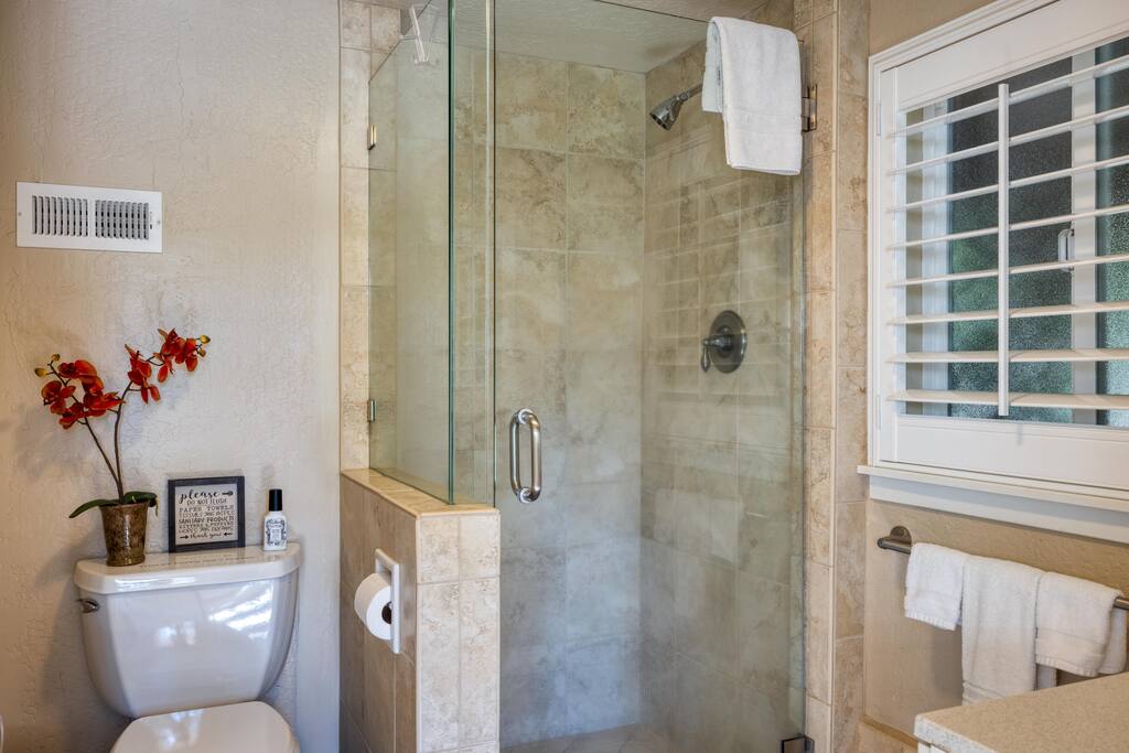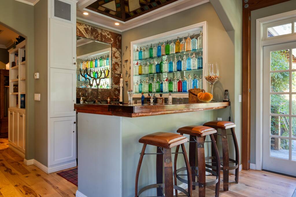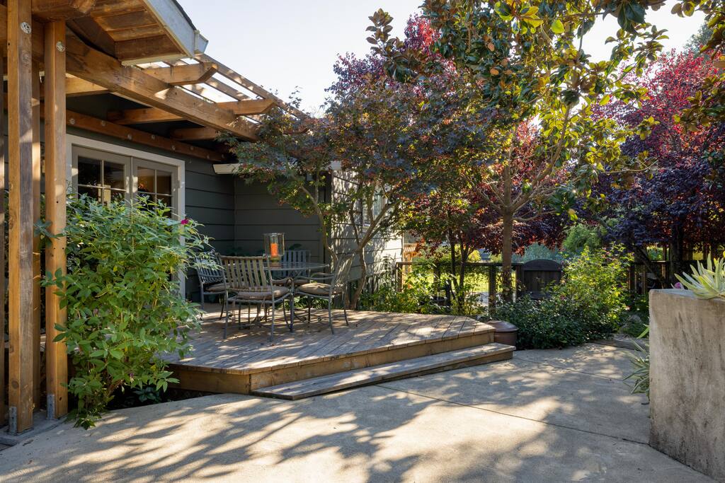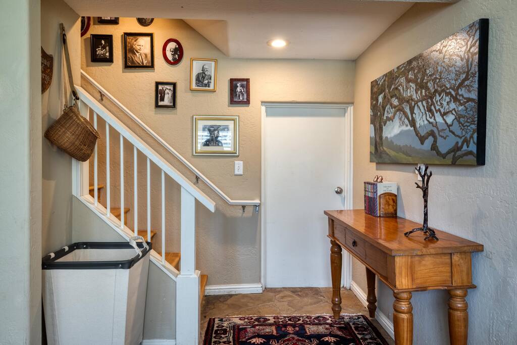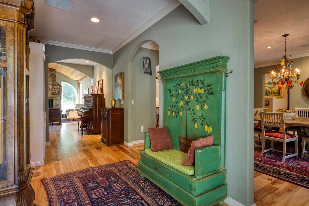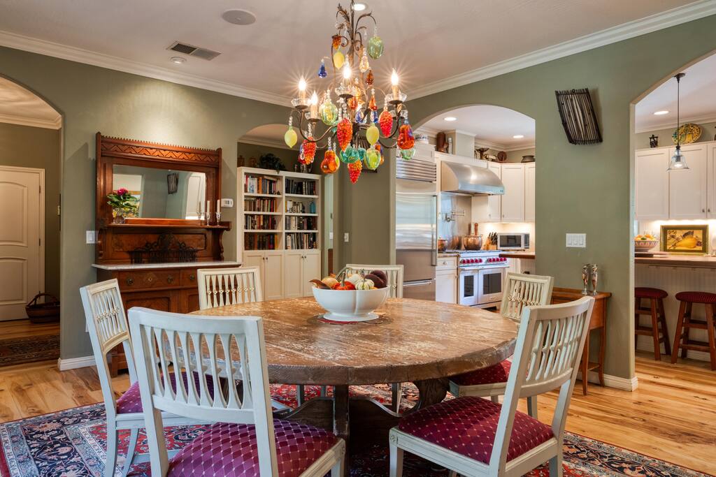 Situated on 2 acres, step into the enchanting Barrel House gardens where you will be greeted by the sight of lush greenery, vibrant flowers, and charming arbors clothed in wisteria and roses. Spend your mornings basking in the sunshine as you sip your coffee surrounded by nature's beauty. Take leisurely strolls through the well-manicured pathways, or find a cozy spot to unwind with a good book. As you venture further, you'll discover the centerpiece of our oasis—a magnificent pool where you can cool off, swim laps, or simply float aimlessly while soaking up the warm rays of the wine country sunshine. Slide into the crystal-clear waters and let the cares of the world drift away. For the ultimate relaxation, immerse yourself in the soothing bubbles of the hot tub, where your worries will melt away under the starlit sky. Step inside the charming Barrel House and prepare to be captivated by the grandeur of the huge stone fireplace that takes center stage in the living area. Whether you're gathering around for a cozy evening with loved ones or simply enjoying its mesmerizing glow, this fireplace provides a touch of warmth and charm that's second to none. The interior of our Barrel House exudes comfort and style with tasteful wine country décor and thoughtful touches throughout. The spacious bedrooms offer serene retreats, where you can rejuvenate after a day of exploration or relaxation. The fully equipped chef's kitchen beckons to the culinary enthusiast, encouraging the creation of delicious meals to be savored in the inviting dining area. In addition to the breathtaking amenities, our location is an ideal hub for adventure. Explore nearby hiking trails, discover charming local shops, or indulge in culinary delights at the finest restaurants in town. Whether you seek outdoor excursions or prefer the comforts of your private paradise, this Barrel House caters to your every desire. Experience a stay like no other at our extraordinary Barrel House. Book now and let the pool, hot tub, garden, arbors, and magnificent stone fireplace weave together an unforgettable tapestry of memories for you and your loved ones. Barrel House has TWO internet networks! Carriers are AT&T and Starlink. Other info to note: Guests are welcome to use the Tesla Charger located in the driveway. Whole house generator will automatically turn on during a power outage. Fireplace is gas, no wood necessary. 12 cup Drip coffee maker, bean grinder and electric tea kettle available for guest use (coffee not supplied) Pool is heated via solar during summer months. Winter heating is possible, additional fees apply. Property has a small gym above the garage equipped with weights, rower, treadmill, stationary bike plus a Queen Murphy bed, Toilet, sink, Shower and small kitchenette. Barrel House welcomes you with beautiful hickory wood floors, a spacious living room with coved redwood ceiling and massive stone fireplace, a large dining room, and fully-equipped gourmet, wine country kitchen with table service for 12+. French doors open to a large redwood deck with views of Dry Creek Valley and hillside vineyards. Broad steps lead down to an 8-person hot tub, spectacular salt water swimming pool, spacious lawns, shaded grape and wisteria gazebo and a seasonal creek. On the main floor, you’ll find the living room with large wet bar, dining room, kitchen and two large bedrooms furnished with king sized beds. Picture windows in each bedroom overlook the Barrel House vineyards, pool and grounds. The main floor also has two full baths, a powder room and laundry available. Stairs to the lower floor lead to the family room with wet bar and large flat-screen TV, a full bathroom and a third bedroom with a queen sized bed plus 2 twin beds.
