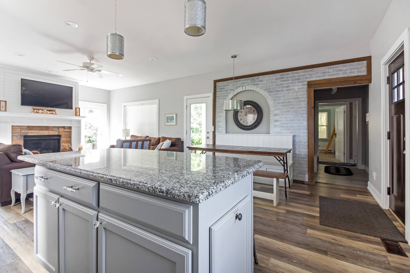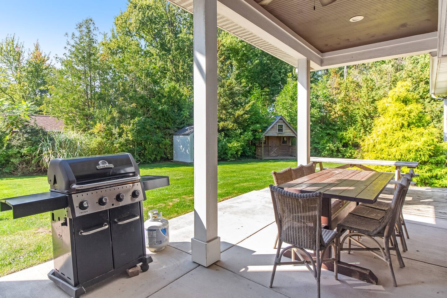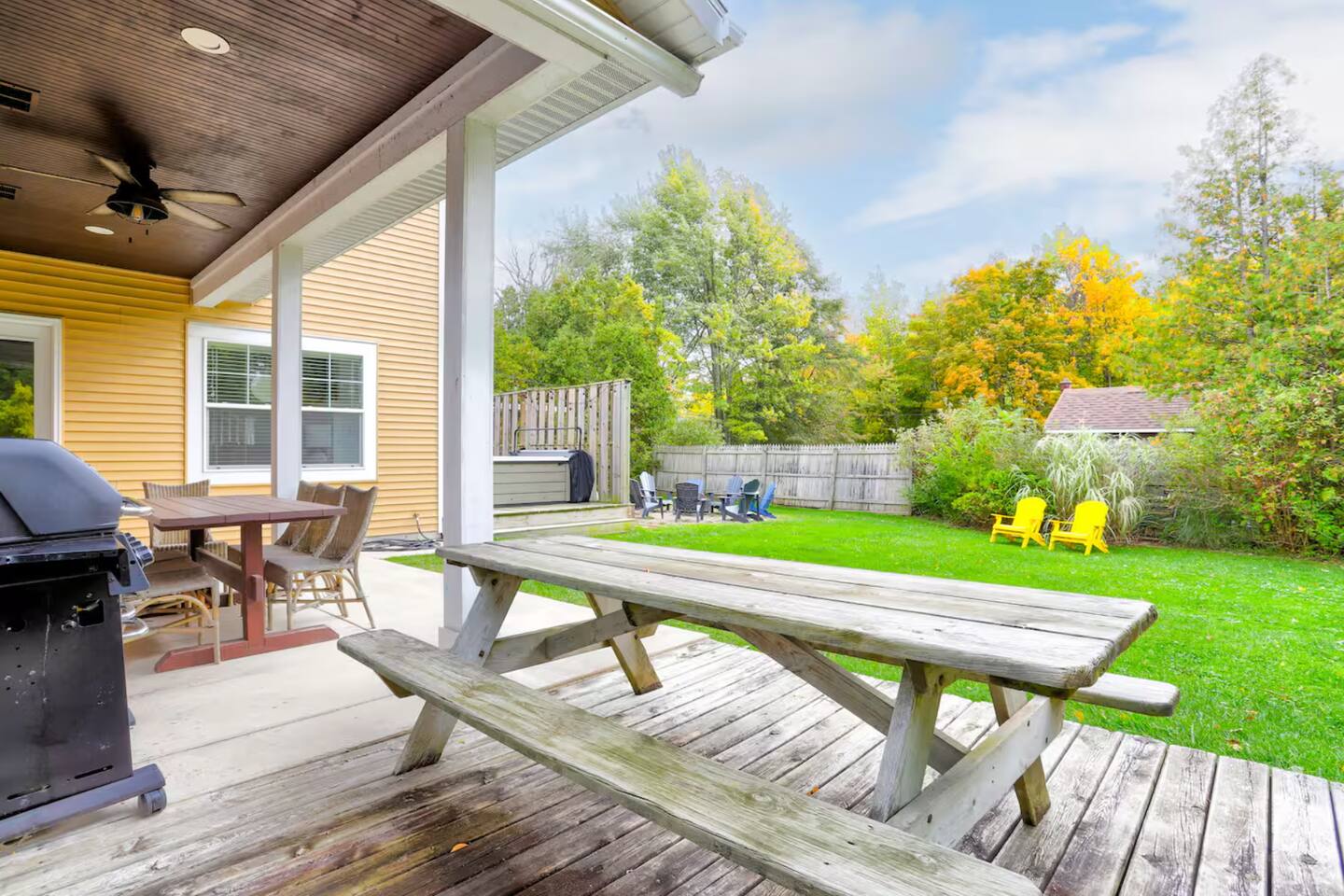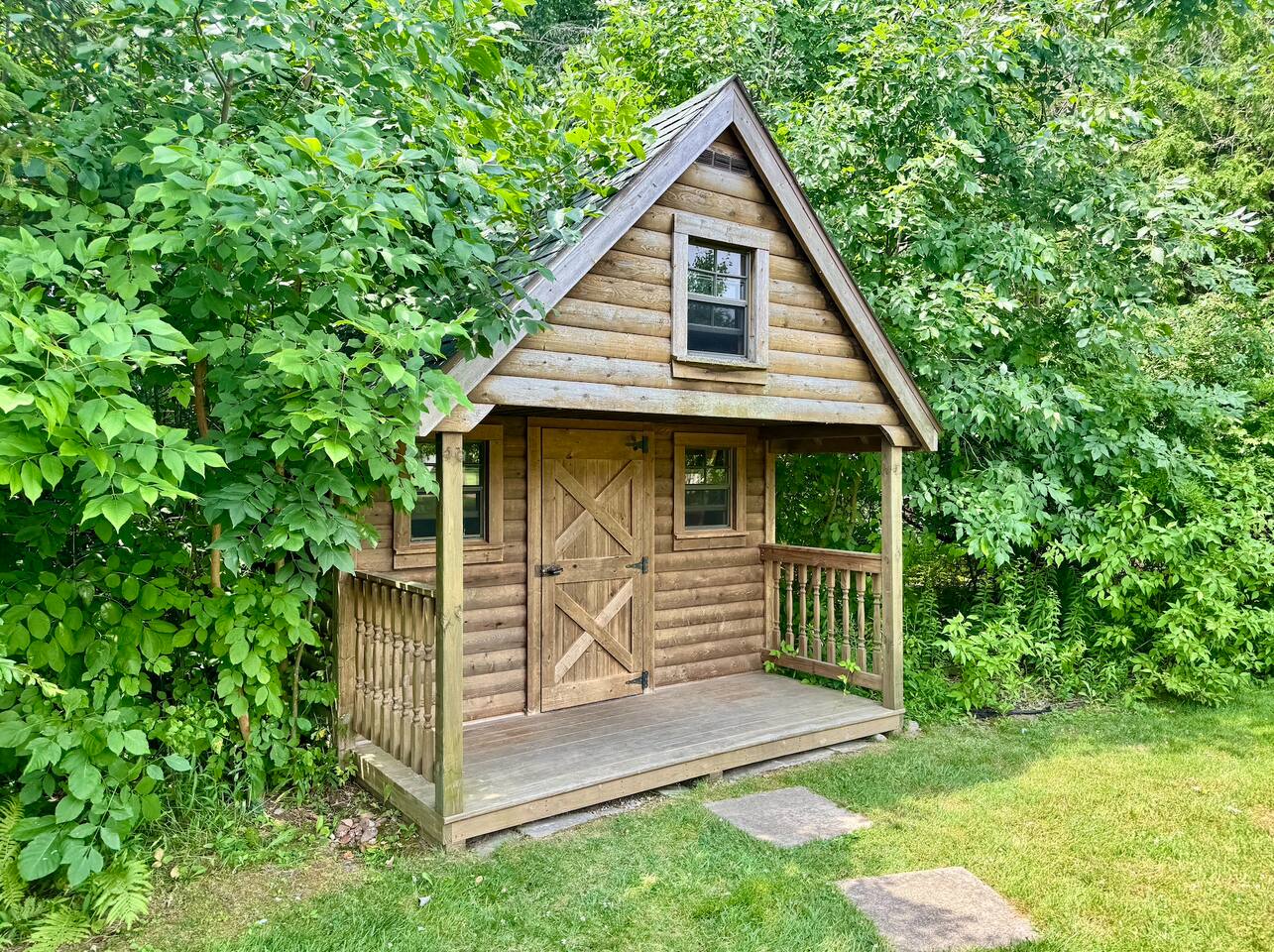 Once you arrive, you’ll step directly into the heart of the house—an open-concept kitchen, dining area, and living room anchored by a cozy fireplace. This is where mornings begin with fresh coffee and casual breakfasts, and evenings wind down with a glass of wine. Upstairs, you’ll find three bedrooms thoughtfully arranged for comfort and privacy, along with a full bathroom. Each room has a queen bed and provides a quiet space to rest after a day at the beach. One of the bedrooms has an en-suite half bathroom. To the right of the main entry lies a completely separate wing of the home—part of the original structure—which gives the property its unique character. Here, you'll find another cozy living room, the more bedrooms, two full bathrooms, and a game room designed for both kids and adults to enjoy. The game room features a pool table that converts to a ping pong table, a foosball table, and enough space for hours of friendly competition. Just off this space is the screened-in patio—perfect for morning reading, afternoon board games, or quiet evening conversations away from the crowd. Step outside and you’ll find one of the home’s best features: a large, tree-lined backyard that feels like your own private park. The deck offers space to dine al fresco or unwind in the brand-new hot tub. Kids can explore the log cabin playhouse, swing from the swing set, or run freely in the open yard while the adults gather around the fire pit as the stars come out. Whether you're spending the day at the private community beach just a short walk away, exploring the nearby towns of Saugatuck and South Haven, or simply enjoying the home itself, this is a place designed to make you feel relaxed, connected, and completely at ease. The property is located: - 350 feet from Lake Michigan - 5 miles from downtown South Haven - 15 miles from downtown Saugatuck STR Registration #161