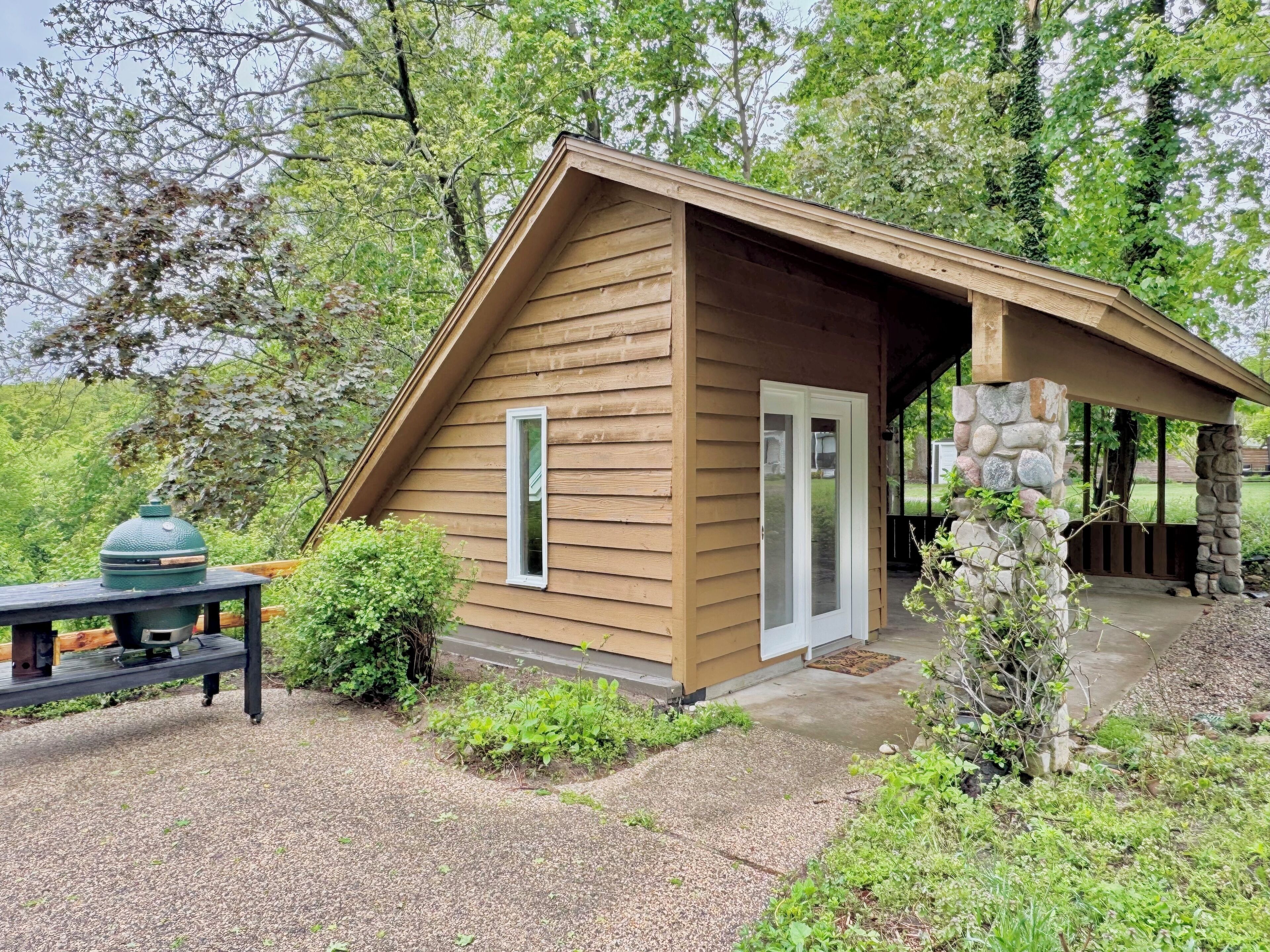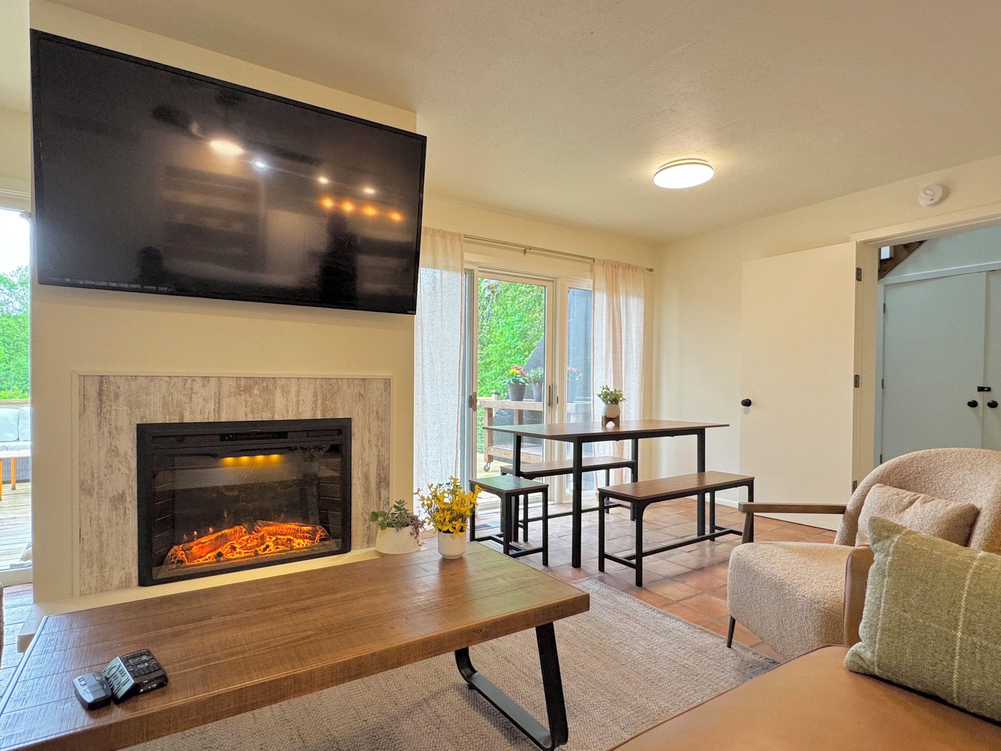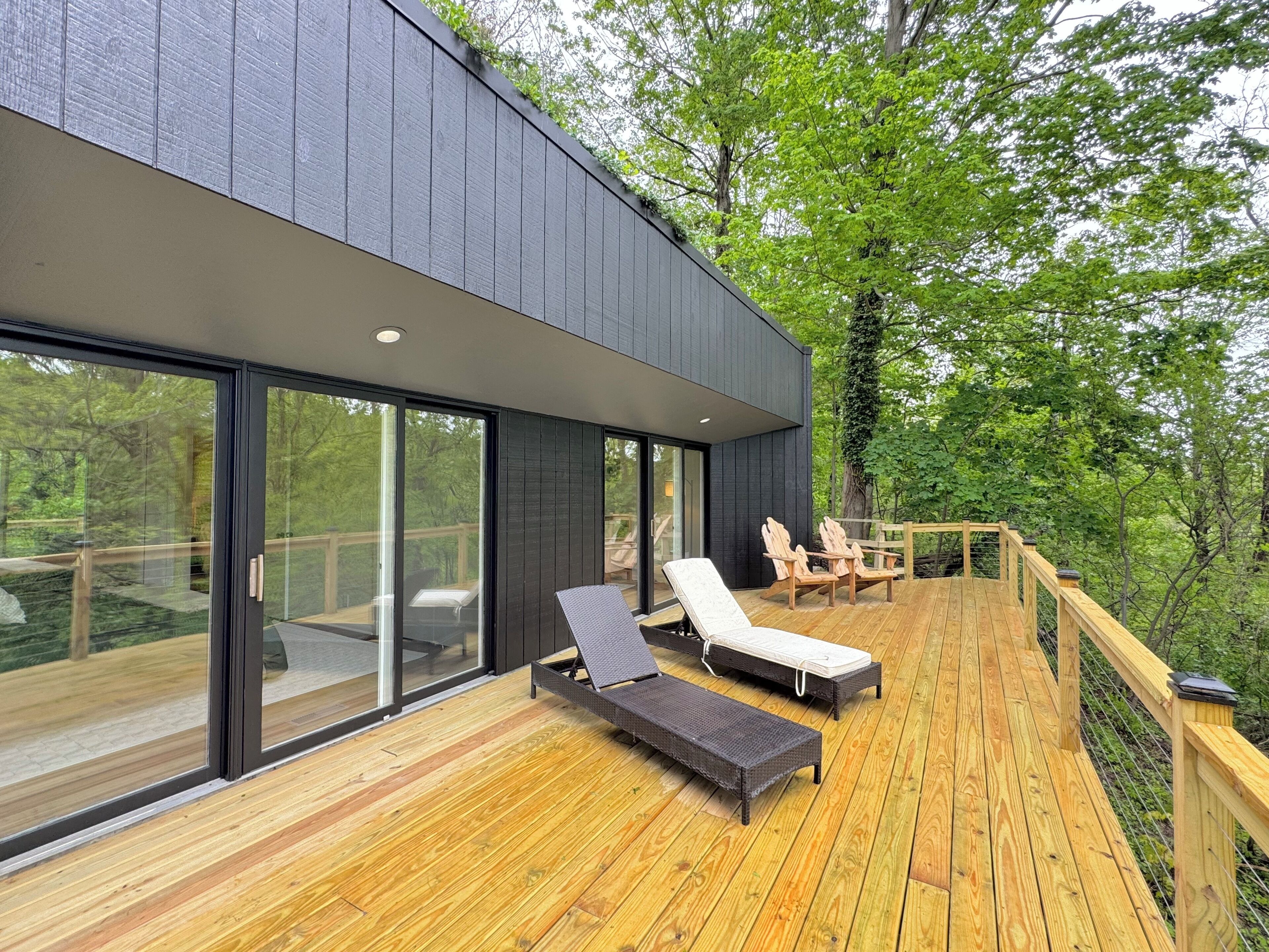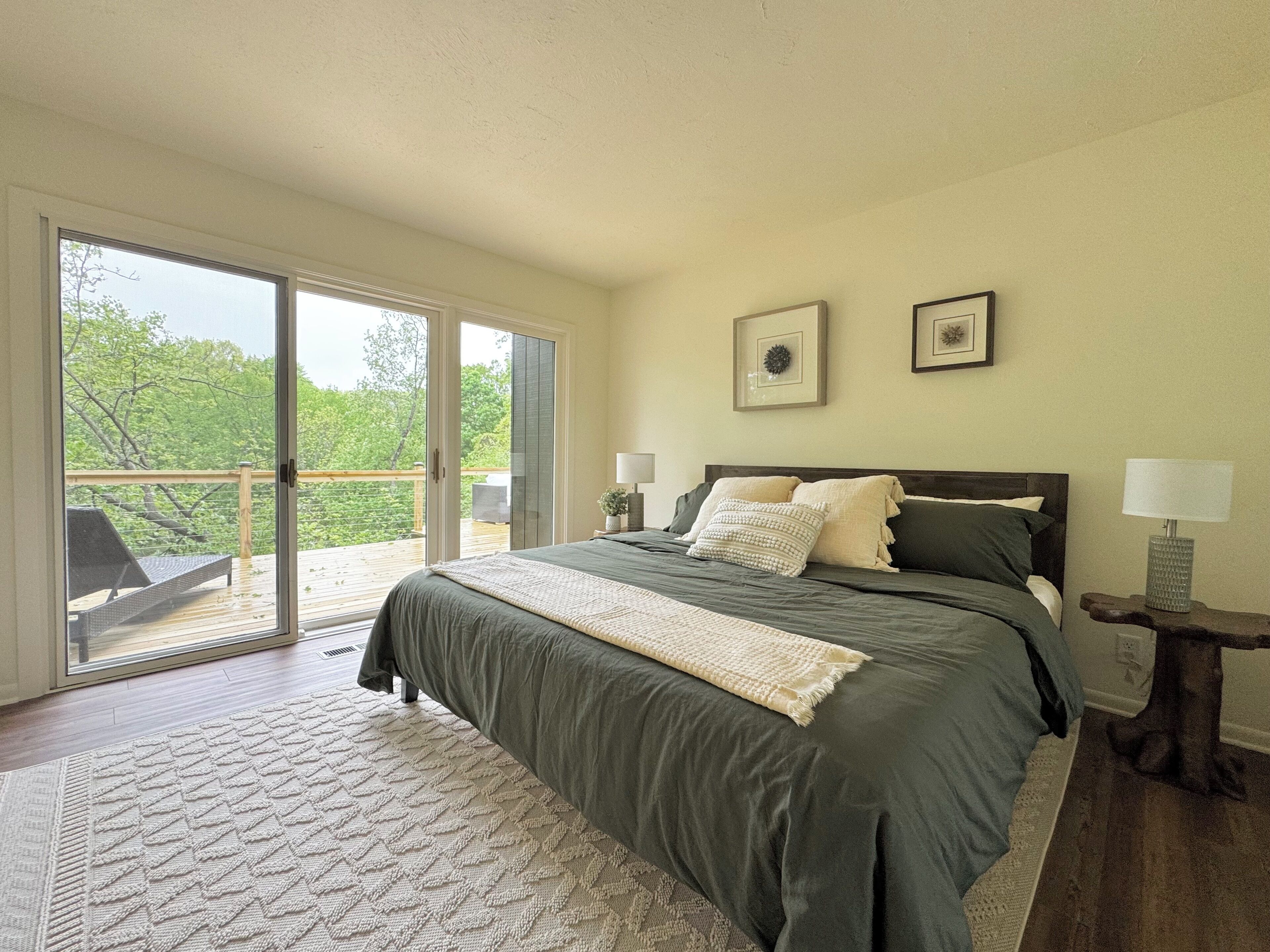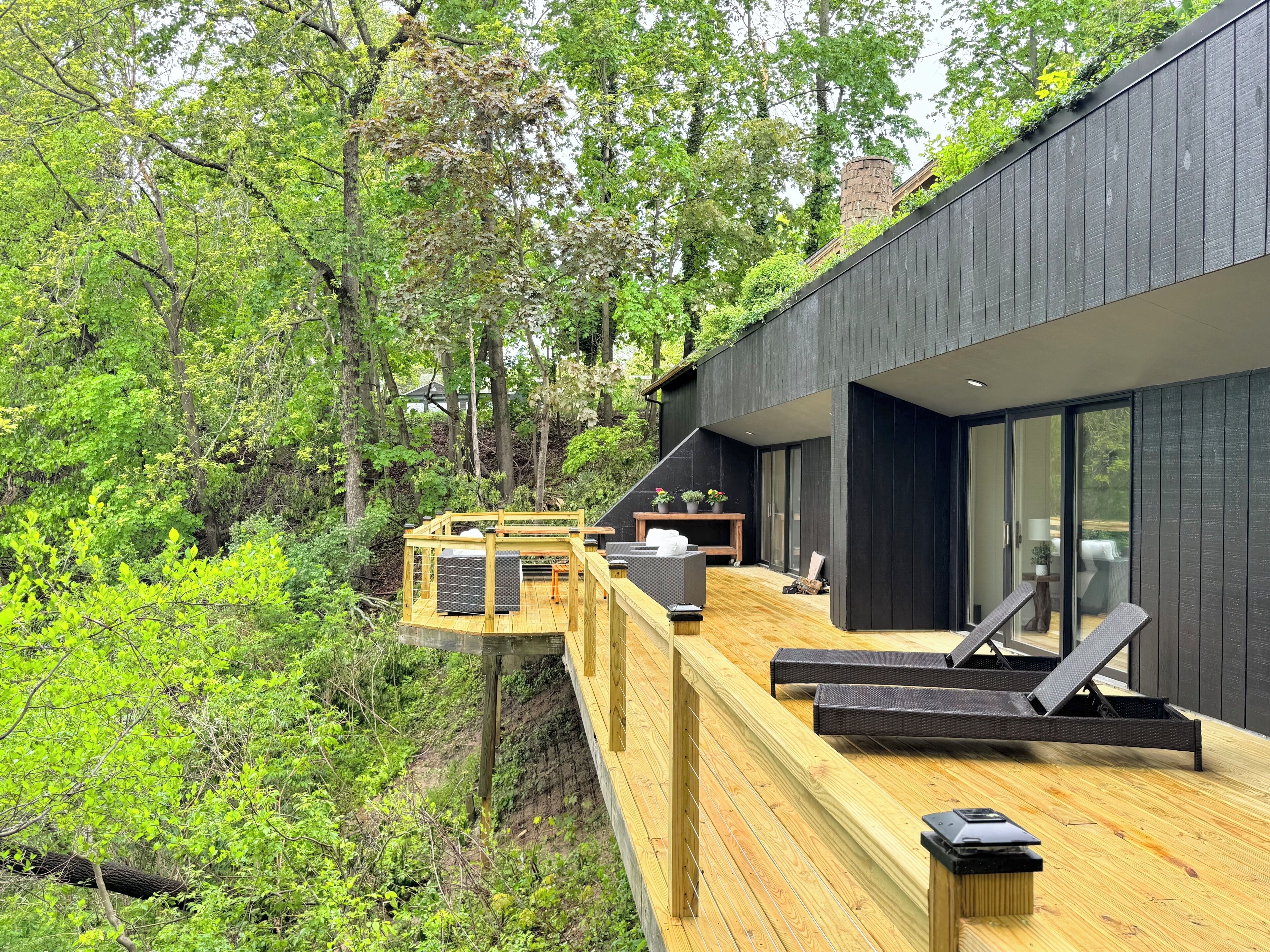Once you arrive at The Fox Den, you'll see only a single entry door. Built into the hillside and hidden from view, the home gradually reveals itself as you descend the interior staircase. At the bottom, the space opens up into a warm, fully-renovated retreat with a wall of windows overlooking the wooded ravine. Once inside, you'll enter an open living and kitchen area, thoughtfully designed with cozy furnishings, a fireplace, and peaceful views through floor-to-ceiling windows. Continue down the hallway to find 2 Bedrooms with king beds, both offering direct access to the expansive deck through sliding glass doors. You'll also find a 3rd bedroom with a queen bed and daybed—ideal for kids, guests, or a quiet reading nook. The home features a unique bathroom layout: two half baths—each with its own toilet and sink—connected by one shared shower. The expansive deck outside is the standout feature - completely private and nestled in the trees. You'll find cozy areas for dining, lounging, and soaking up the views. Just around the corner is the secluded hot tub, offering a peaceful, tucked-away space to relax after a day of exploring. Though you’re just a few blocks from the heart of downtown Douglas, the home feels peaceful and remote—set on over an acre of wooded land and perched above a quiet ravine. Whether you're walking to art galleries and restaurants or spending the day in Saugatuck or at Oval Beach, The Fox Den offers the perfect balance of access and retreat. The Essentials: - Fully equipped kitchen - High-speed Wi-Fi - Smart TV and fireplace - Washer and dryer - Air conditioning and heat - Ample parking - A Tranquil Lakeshore Getaway Whether you’re here to unwind, explore, or reconnect, The Fox Den gives you a rare combination of modern comfort, total privacy, and proximity to everything that makes the Saugatuck-Douglas area special. It’s a space you’ll remember—and want to return to. STR Registration # CR25-047