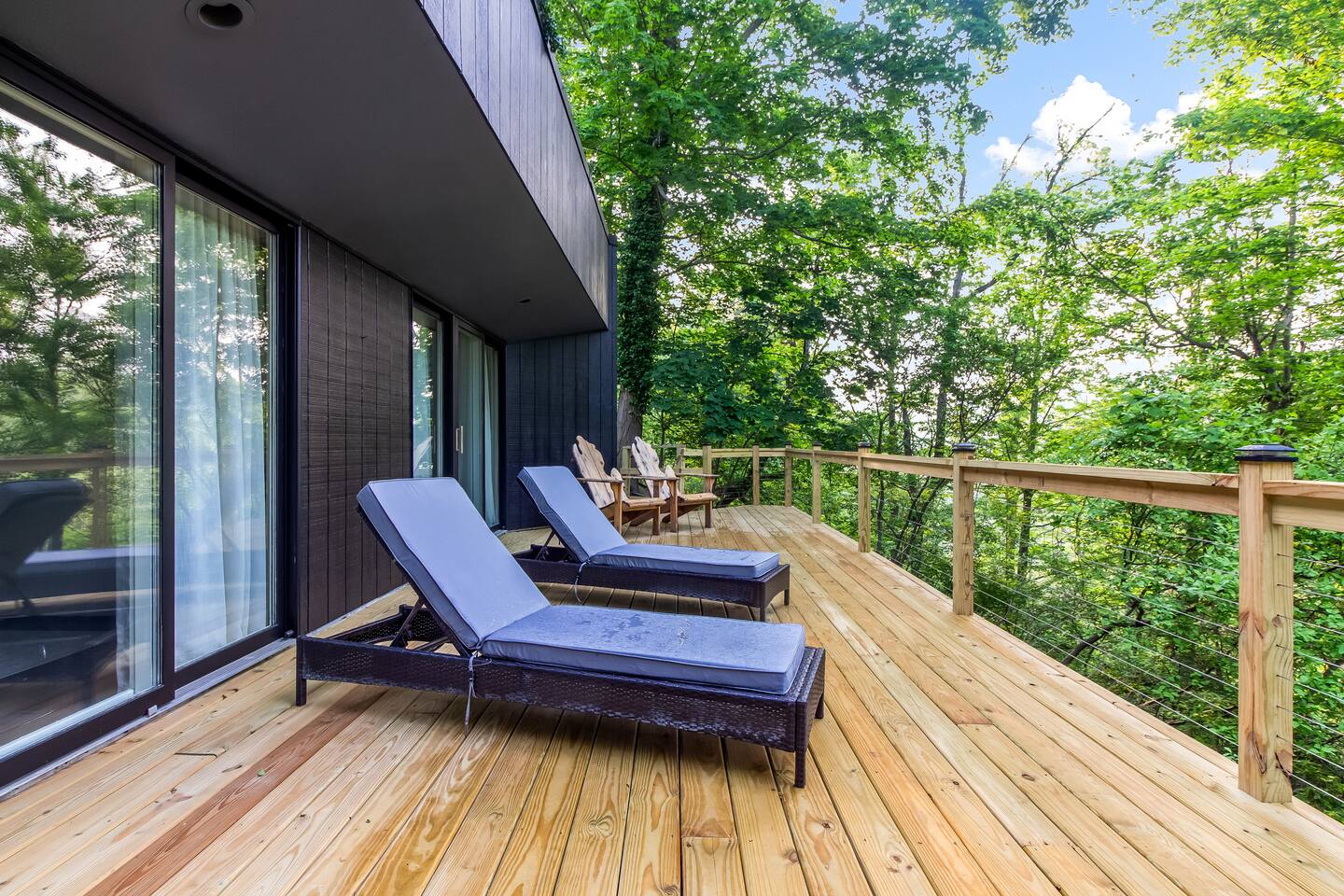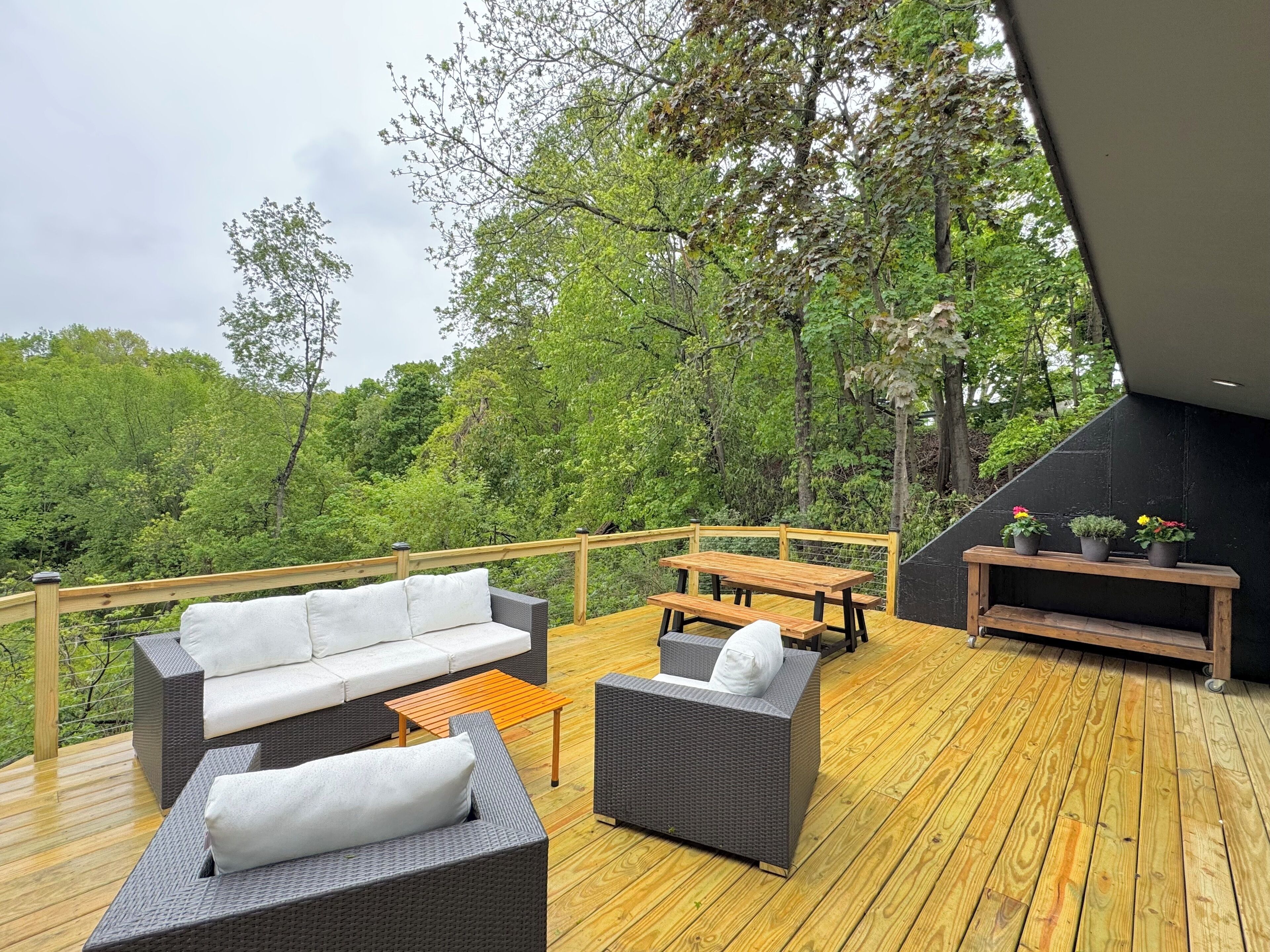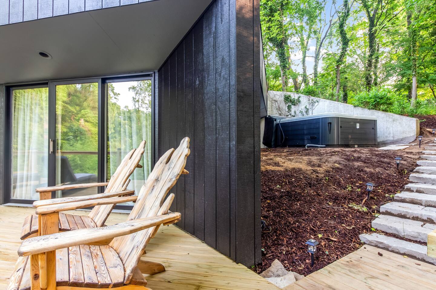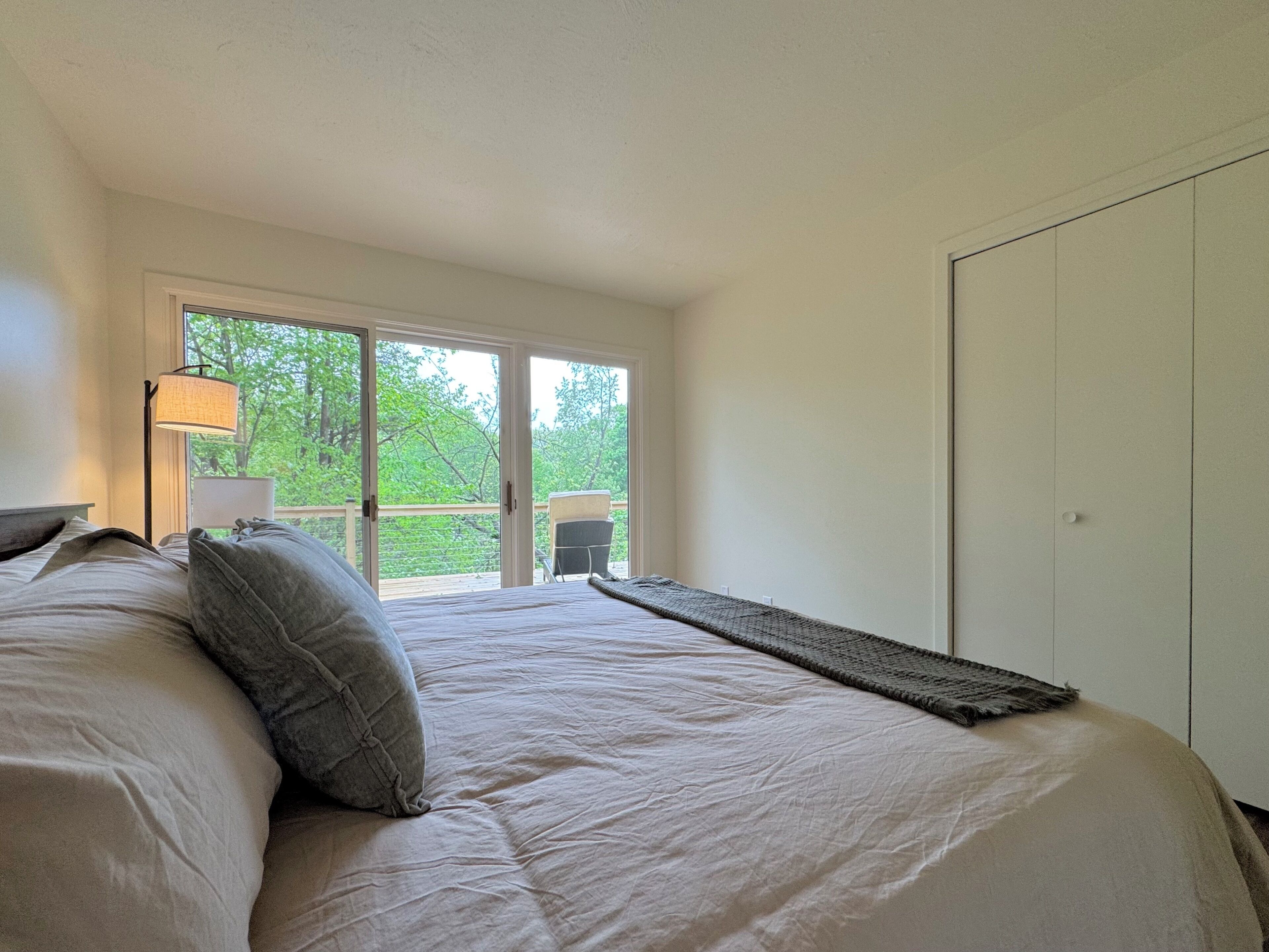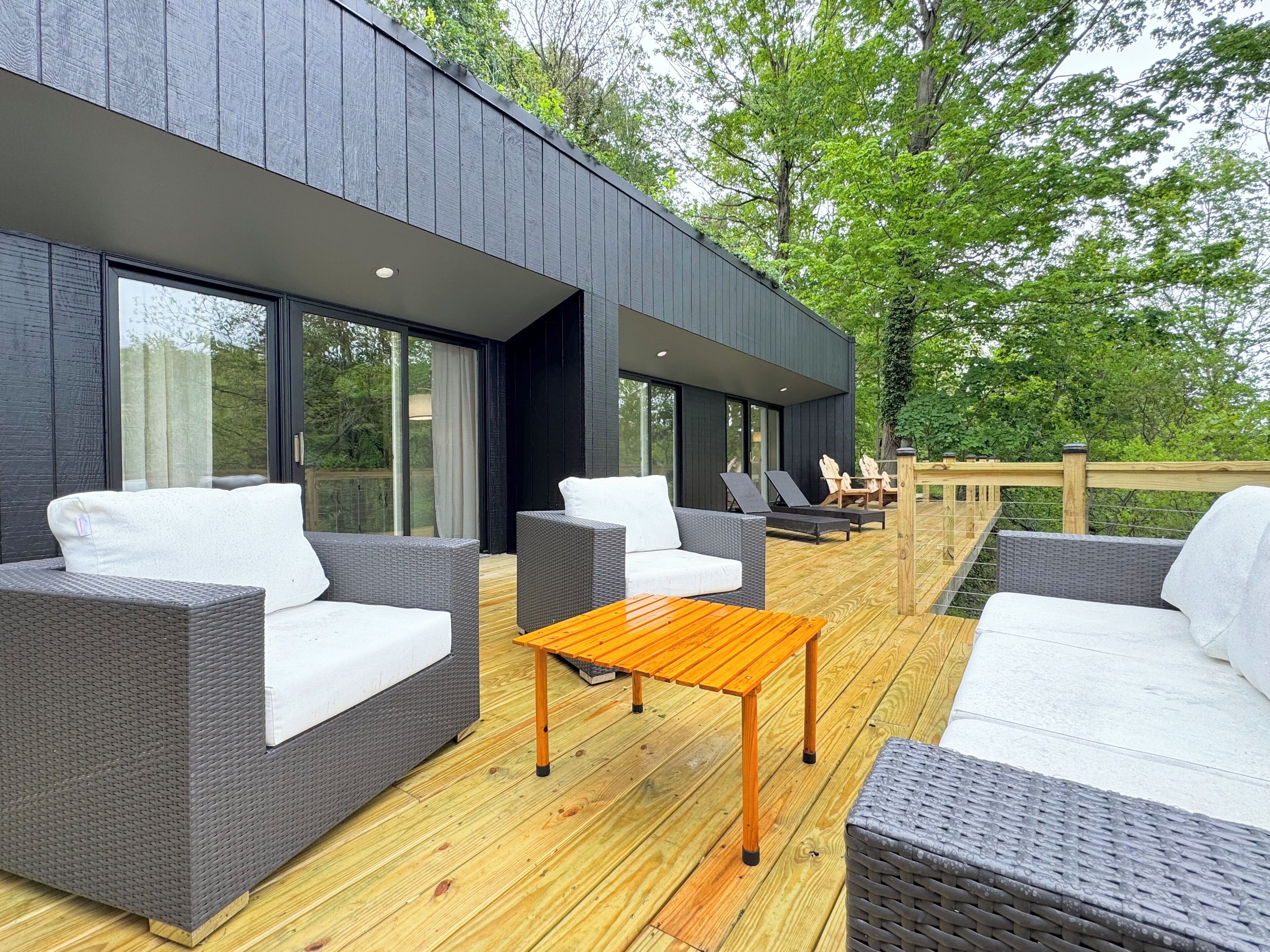 Once you arrive at The Fox Den, you'll see only a single entry door. Built into the hillside and hidden from view, the home gradually reveals itself as you descend the interior staircase. At the bottom, the space opens up into a warm, fully-renovated retreat with a wall of windows overlooking the wooded ravine. Once inside, you'll enter an open living and kitchen area, thoughtfully designed with cozy furnishings, a fireplace, and peaceful views through floor-to-ceiling windows. Continue down the hallway to find 2 Bedrooms with king beds, both offering direct access to the expansive deck through sliding glass doors. You'll also find a 3rd bedroom with a queen bed and daybed—ideal for kids, guests, or a quiet reading nook. The home features a unique bathroom layout: two half baths—each with its own toilet and sink—connected by one shared shower. The expansive deck outside is the standout feature - completely private and nestled in the trees. You'll find cozy areas for dining, lounging, and soaking up the views. Just around the corner is the secluded hot tub, offering a peaceful, tucked-away space to relax after a day of exploring. Though you’re just a few blocks from the heart of downtown Douglas, the home feels peaceful and remote—set on over an acre of wooded land and perched above a quiet ravine. Whether you're walking to art galleries and restaurants or spending the day in Saugatuck or at Oval Beach, The Fox Den offers the perfect balance of access and retreat. The Essentials: - Fully equipped kitchen - High-speed Wi-Fi - Smart TV and fireplace - Washer and dryer - Air conditioning and heat - Ample parking - A Tranquil Lakeshore Getaway Whether you’re here to unwind, explore, or reconnect, The Fox Den gives you a rare combination of modern comfort, total privacy, and proximity to everything that makes the Saugatuck-Douglas area special. It’s a space you’ll remember—and want to return to. STR Registration # CR25-047