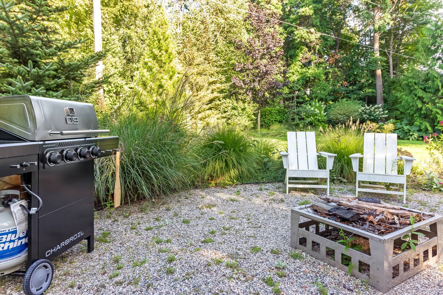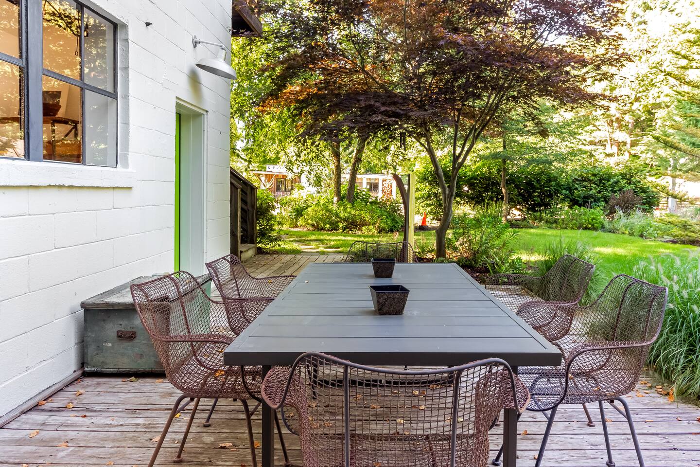 Originally built in 1950 as an auto body shop and most recently a beloved art gallery, this unique space retains its raw, authentic character—including the subtle, colorful splatters of paint on the floors that tell a story all their own. Today, this 2-bed 1-bath retreat blends industrial charm with modern comfort in a gallery-inspired layout. Step inside to find a spacious open-concept living area with a full kitchen, dining area, and lounge for gathering. A spiral staircase leads to a cozy loft office—perfect for reading, writing, or remote work. Both bedrooms sit at the back of the home for quiet privacy. The primary suite features a king bed and private deck overlooking the expansive lawn and gardens, while the second bedroom offers a queen bed. Being a loft, the top portion of the second bedroom walls are open to the surrounding living areas. The full bathroom includes a washer and dryer for added convenience. Outdoors, nearly 2 acres of landscaped grounds invite relaxation. Multiple decks and shaded nooks create the perfect backdrop for morning coffee or al fresco dinners under the trees. You'll also find a gas grill and fire pit, both of which are shared with the apartment upstairs. Centrally located on Blue Star Highway, you’re just 2 minutes to downtown Saugatuck, 3 minutes to downtown Douglas and under 10 minutes to Oval Beach. Wineries, galleries, restaurants, and Lake Michigan’s shoreline are all within easy reach—making The Gallery Loft a distinctive and inspiring base to explore the best of the Art Coast. The property is pet-friendly, we just ask that you please pets off furniture and clean up after them in the yard. Book your stay and become part of this home’s next chapter! STR Registration #- CR23-064