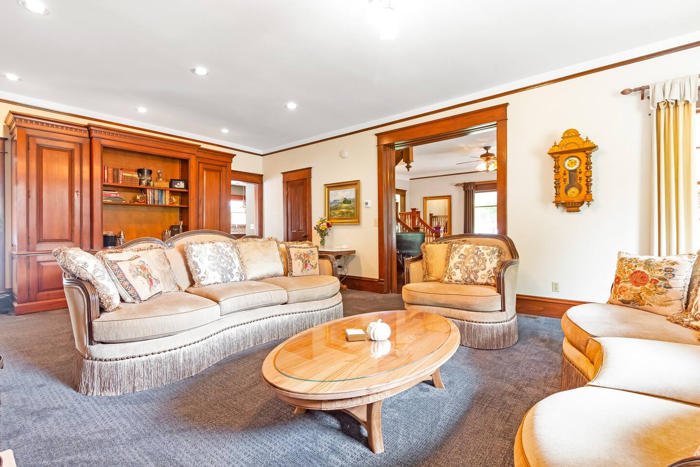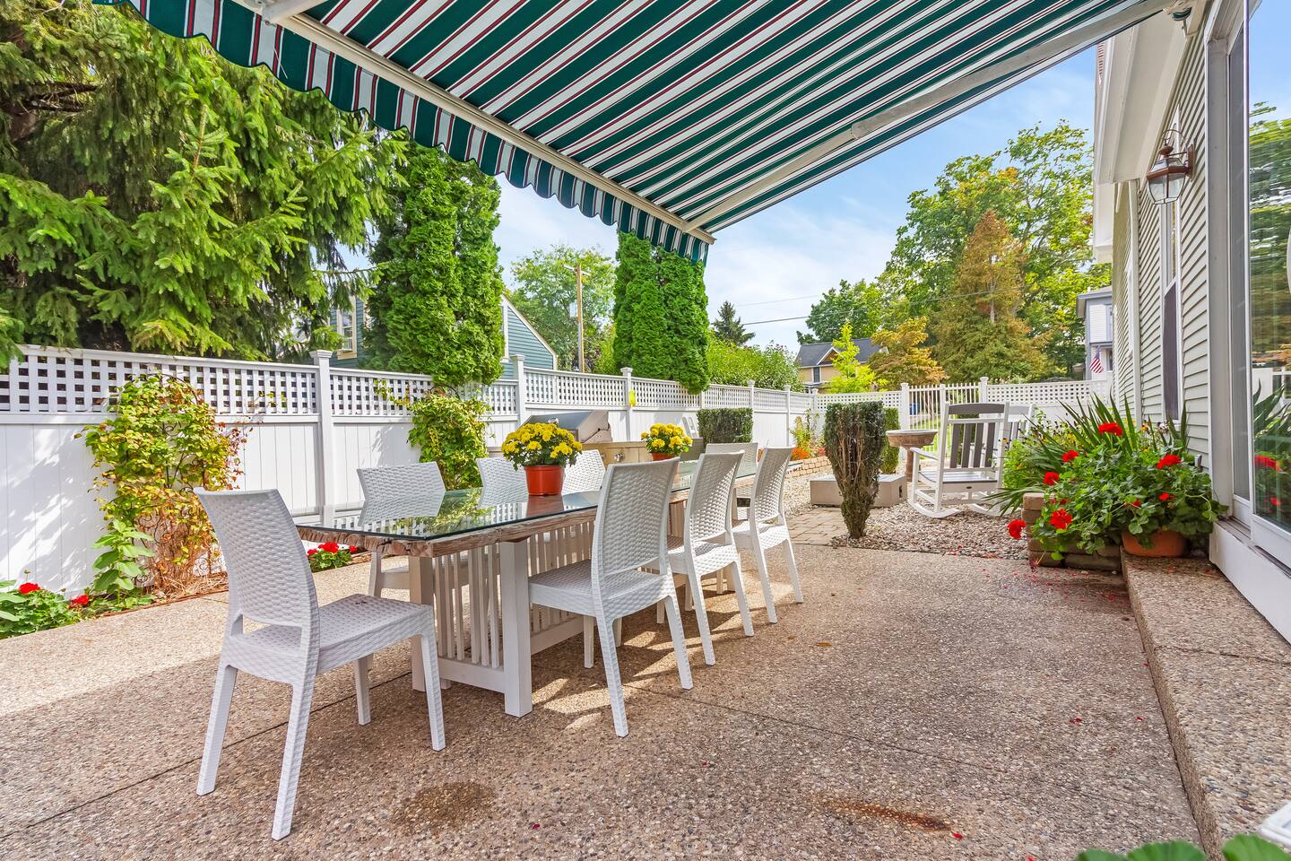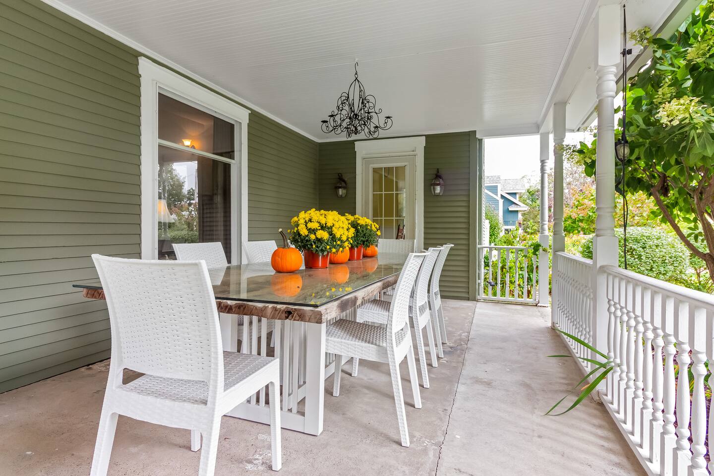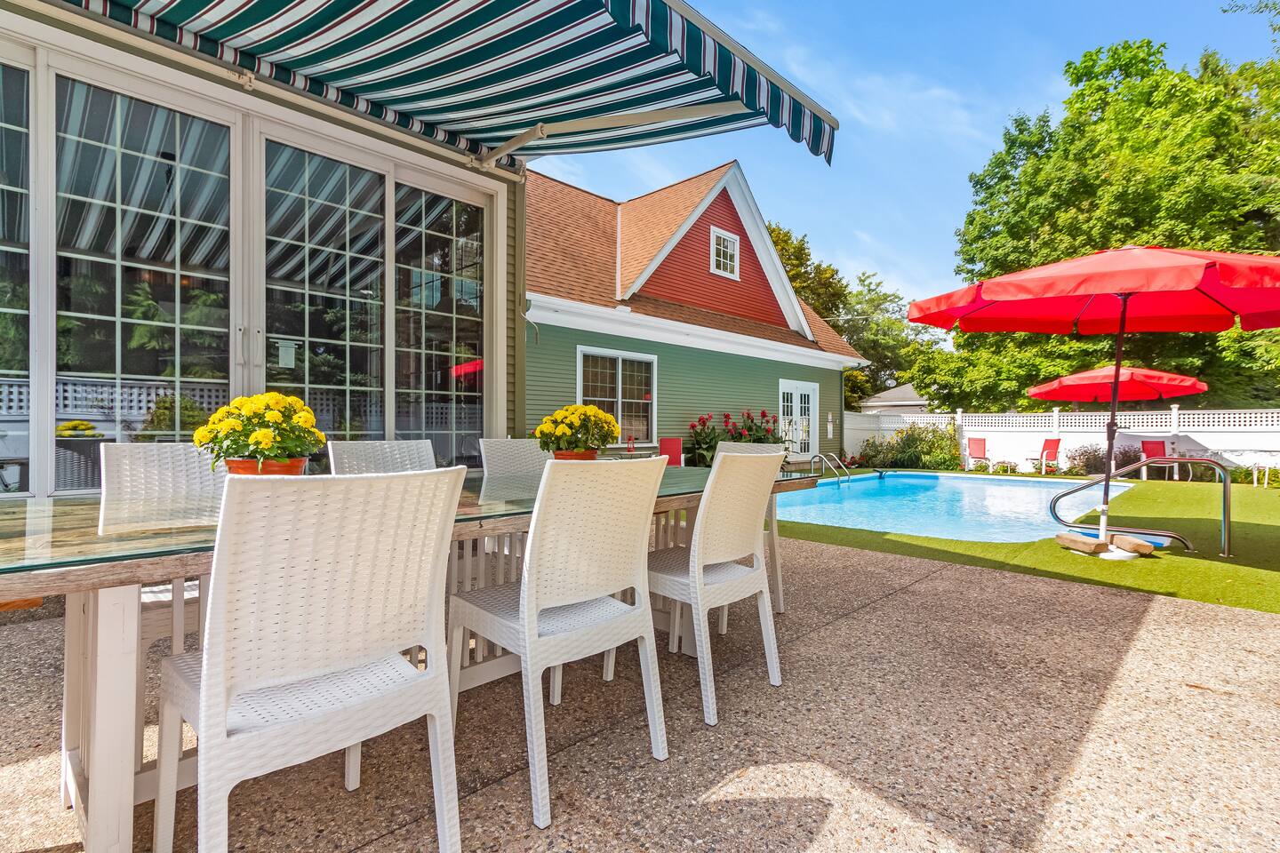 Upon arrival, you'll step up onto the welcoming wraparound front porch, complete with classic rocking chairs and a large covered dining table—perfect for evening meals or morning coffee with friends and family. Inside, the grand entryway sets the tone with its sweeping staircase and elegant piano. To the left, the main living room invites you to unwind beside a beautiful gas fireplace surrounded by designer furnishings. Continue through to the heart of the home—an open kitchen, dining, and living area that flows seamlessly to the back patio and private pool. Whether you’re cooking, entertaining, or lounging poolside, every space has been designed for effortless relaxation. Just past the kitchen, you’ll find a formal dining room ideal for special dinners, along with a half bath and laundry area for convenience. Upstairs are four beautifully appointed bedrooms, each with its own en-suite bathroom. Originally a bed and breakfast, the home is thoughtfully designed to provide every guest with both comfort and privacy. Above the garage, you’ll find the private guest loft — a spacious open-concept studio with vaulted ceilings and a bright, airy feel. It features a comfortable king bed, cozy sitting area with a sofa bed, full kitchen, dining space, and a large bathroom. With its own private entrance, the loft is perfect for guests who want a little extra privacy while still being just steps from the main house and pool area. The property is conveniently located: - 2-minute walk to downtown Douglas shops and restaurants - 5-minute drive to downtown Saugatuck - 7-minute drive to Oval Beach - 10-minute drive to Saugatuck Dunes State Park - 12-minute drive to Fenn Valley Vineyards - 15-minute drive to Holland’s charming downtown boutiques and breweries We look forward to hosting you at the Goshorn House! Registration Number- CR25-029