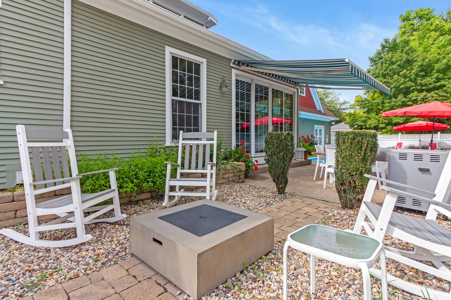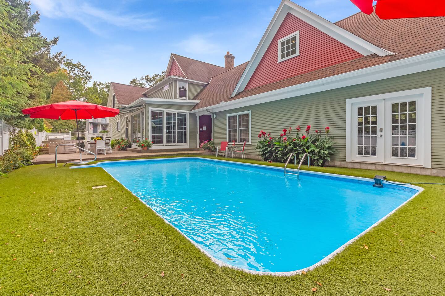 Experience the best of Douglas at this stunning private estate featuring a 4-bedroom main home plus a spacious studio loft above the garage. Perfect for larger groups, each bedroom has an en-suite bath, and the property includes multiple living and dining areas, a chef’s kitchen, and expansive outdoor space with a pool, grill, and fire pit. The guest loft adds extra privacy with its own kitchen and king bed. Walk to downtown Douglas or drive minutes to Saugatuck and Lake Michigan.