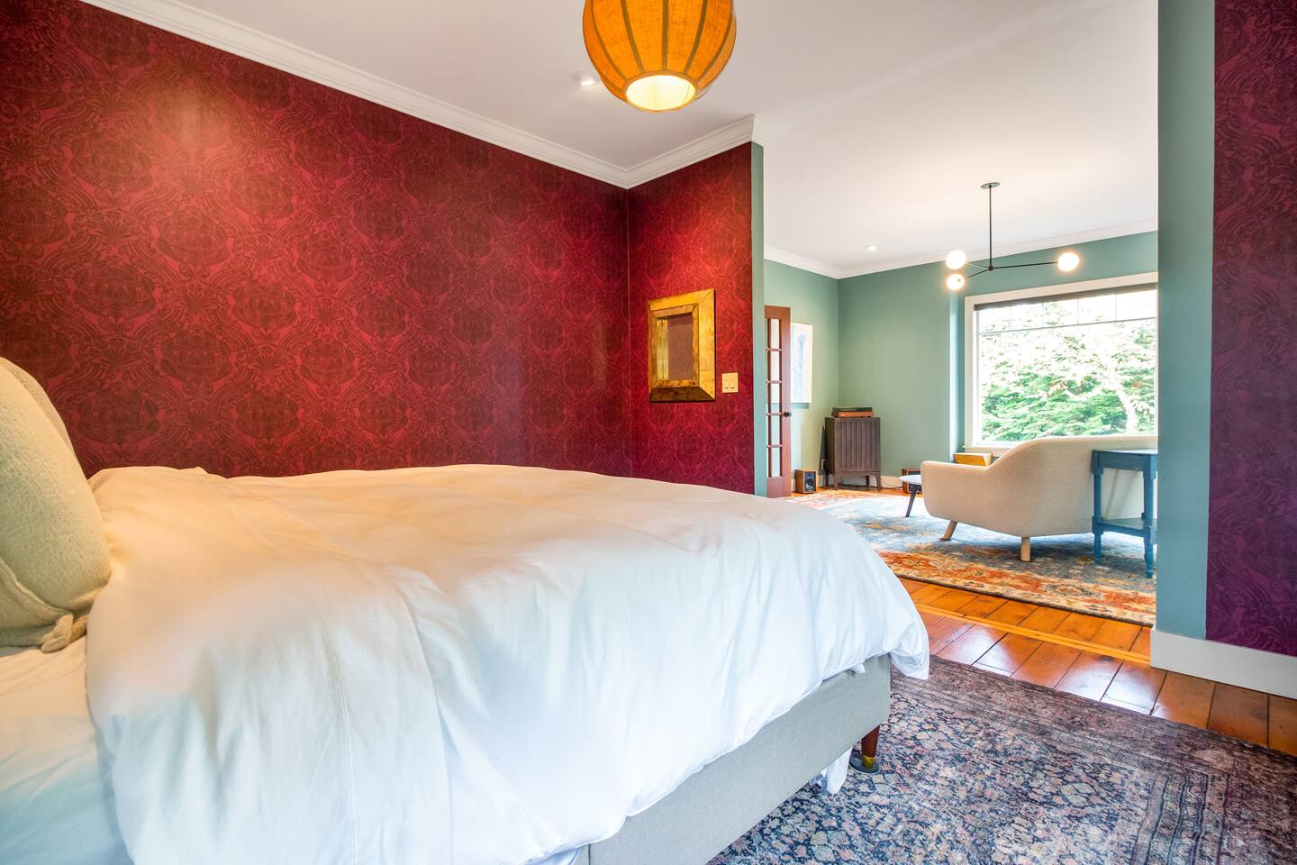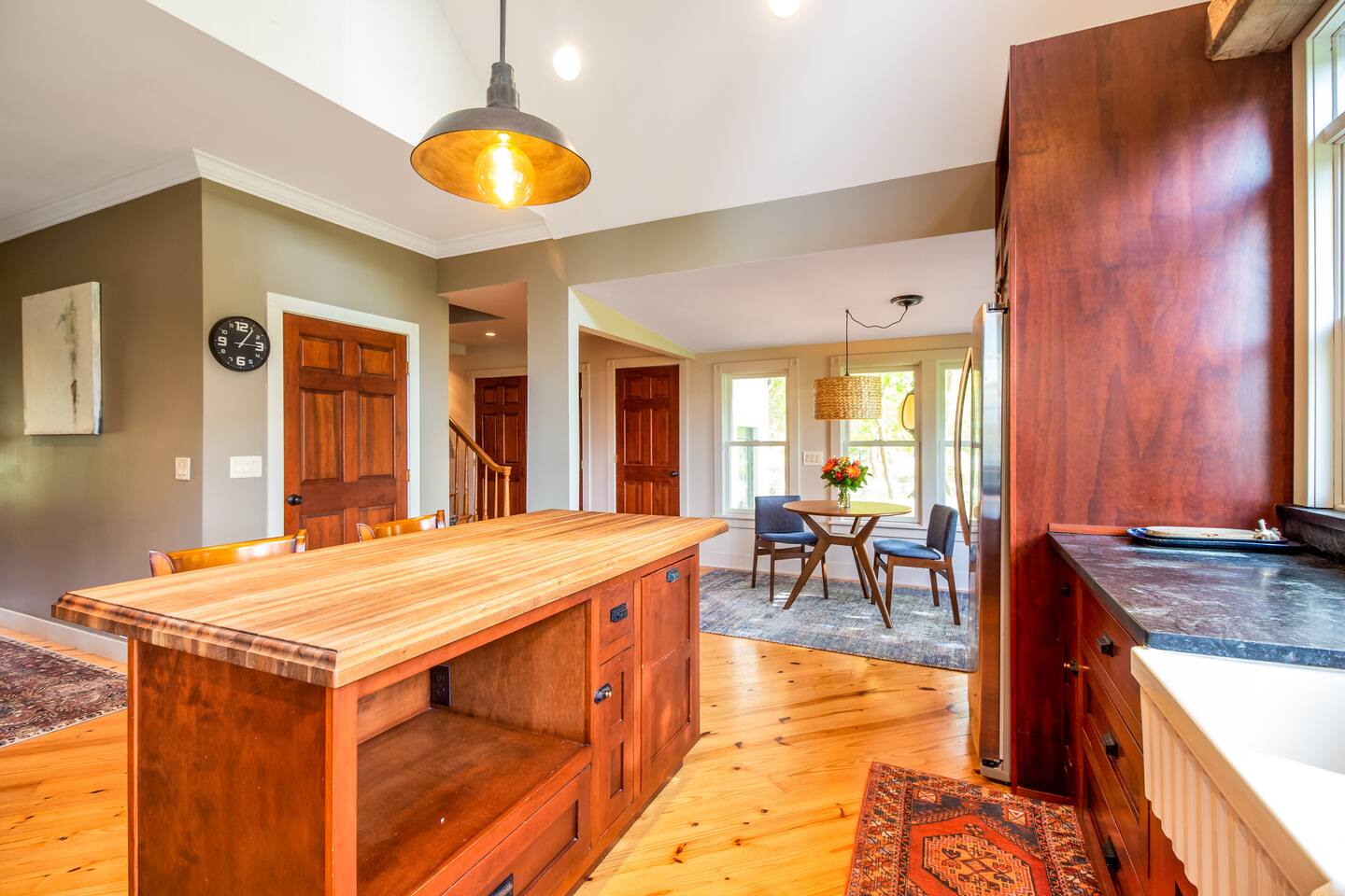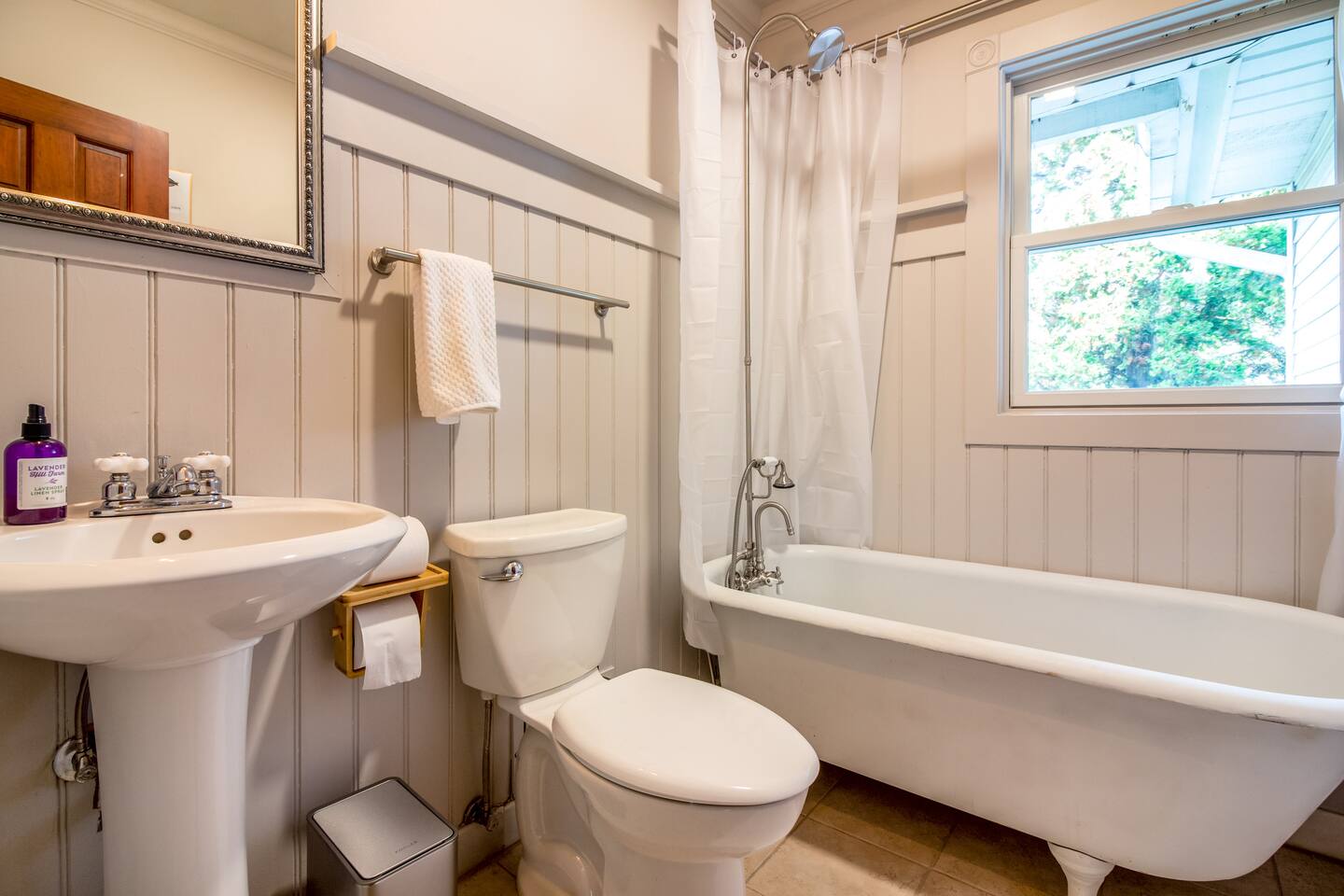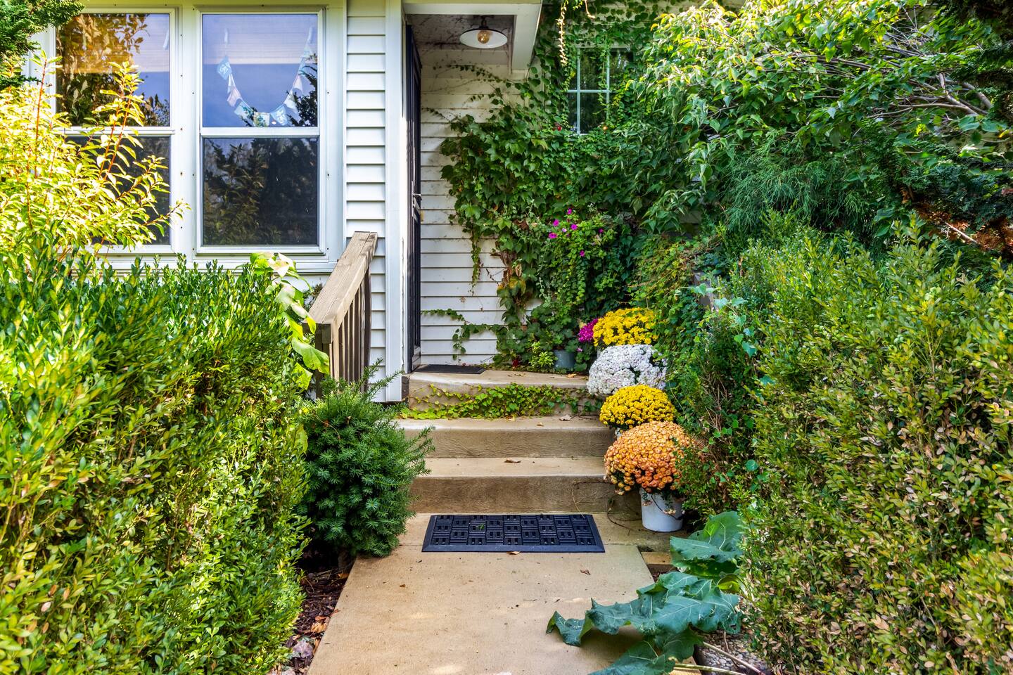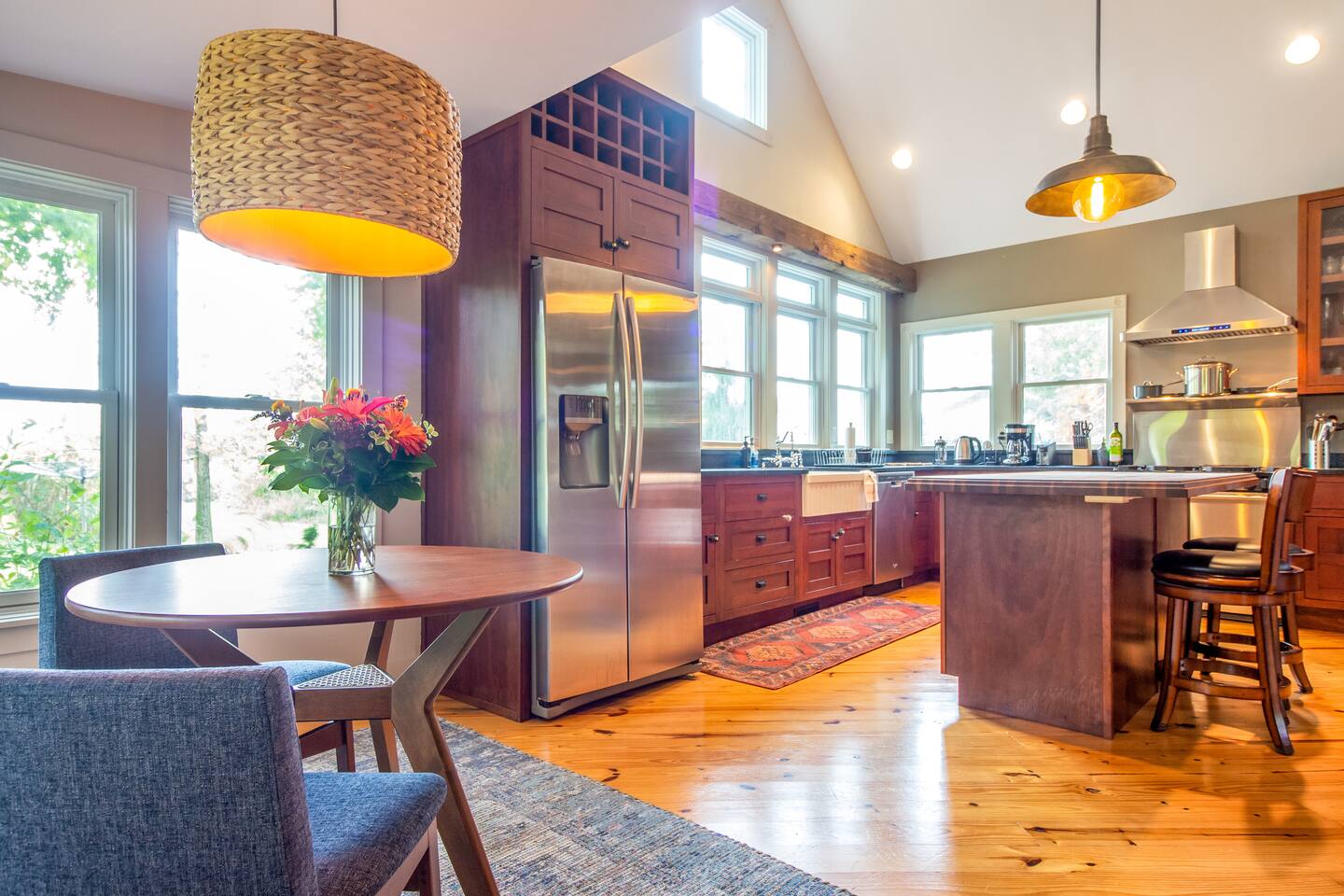 Step inside Grace & Ease, where heritage and heart come together in perfect balance. On the main level, the living room features comfortable seating, a smart TV, and curated artwork, creating the perfect spot to relax after a day exploring the countryside. The dining area sits nearby, ideal for slow dinners and conversation, opening into the gourmet kitchen—a bright and functional space with custom cabinetry, solid oak finishes, and beautiful views of the gardens. A cozy breakfast nook offers a sunny corner to enjoy coffee or tea while taking in the peaceful surroundings. Also on this level, you’ll find the tranquil primary bedroom suite, complete with its own private sitting room. Here, a record player, comfortable seating, and a large picture window create a quiet space for reflection or daydreaming. A full bathroom with modern touches and a laundry area also serve this floor. Upstairs, three inviting guest bedrooms each feature their own personality and cozy charm—perfect for family or friends traveling together. A second full bathroom completes the upper level, providing comfort and convenience for all. Every room at Grace & Ease feels intentional, blending original character with modern comfort, and inviting you to slow down, connect, and fully unwind. Step outside to discover the soul of this property—a spacious yard surrounded by lush, lovingly tended gardens that bloom with life in every season. Wander among flowering trees, peonies, hostas, and a century-old wisteria that drapes gracefully over the landscape. Thoughtful landscaping and mature plantings offer both beauty and privacy, creating a serene environment for morning yoga, reading in the shade, or sunset picnics under the open sky. Grace & Ease isn’t just a place to stay—it’s a place to breathe, reflect, and reconnect with nature’s quiet rhythm. We look forward to welcoming you at Grace & Ease.