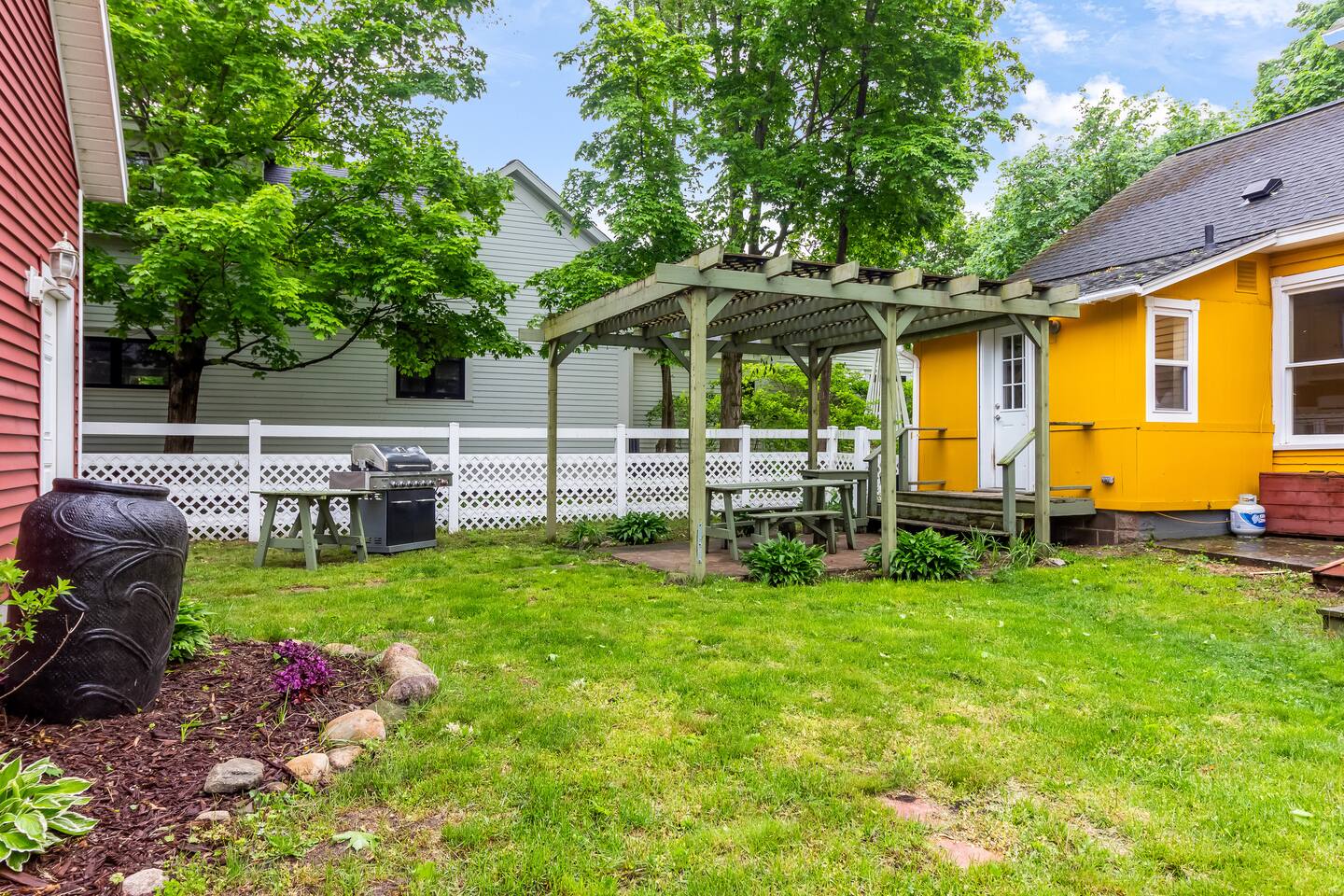 Originally built in 1871, the farmhouse has been gently updated to preserve its soul while enhancing comfort and convenience. Its original character reveals itself in every corner—from the creak of old floorboards to the abundance of natural light that fills the space. The upstairs primary suite offers a quiet sanctuary with its own private bath, tucked beneath the eaves in a space that feels both cozy and expansive. Two additional bedrooms are located on the main floor, thoughtfully arranged to accommodate guests, children, or those looking for a peaceful place to work remotely. A full shared bathroom on the main floor maintains the home's simple, welcoming feel. The heart of the home is the spacious kitchen and adjoining dining area—an ideal gathering place for slow breakfasts, evening meals, or heartfelt conversations that linger long into the night. The kitchen comes fully stocked, making it easy to prepare anything from morning pancakes to a lakeside picnic lunch. Perhaps the most beloved corner of the house is the screened-in sunroom. This light-filled space captures the spirit of the farmhouse—quiet, restorative, and deeply inviting. It’s the perfect place to start your day with a warm mug in hand or to toast the golden hour with a glass of wine and good company. Step outside and you’ll find a fully fenced backyard where your pups can roam freely while you relax beside the fire pit or cook under the open sky on the grill. Surrounded by trees and the sounds of nature, it’s a place made for memory-making—roasting s’mores, telling stories, and enjoying the simple pleasures of outdoor living. Set on a peaceful street, yet just a short walk to downtown Douglas, this home offers the best of both worlds—quiet solitude and vibrant community. Whether you’re here for the lake, the art, or the sense of stillness, Marigold Farmhouse offers a timeless escape. STR Registration #CR25-038