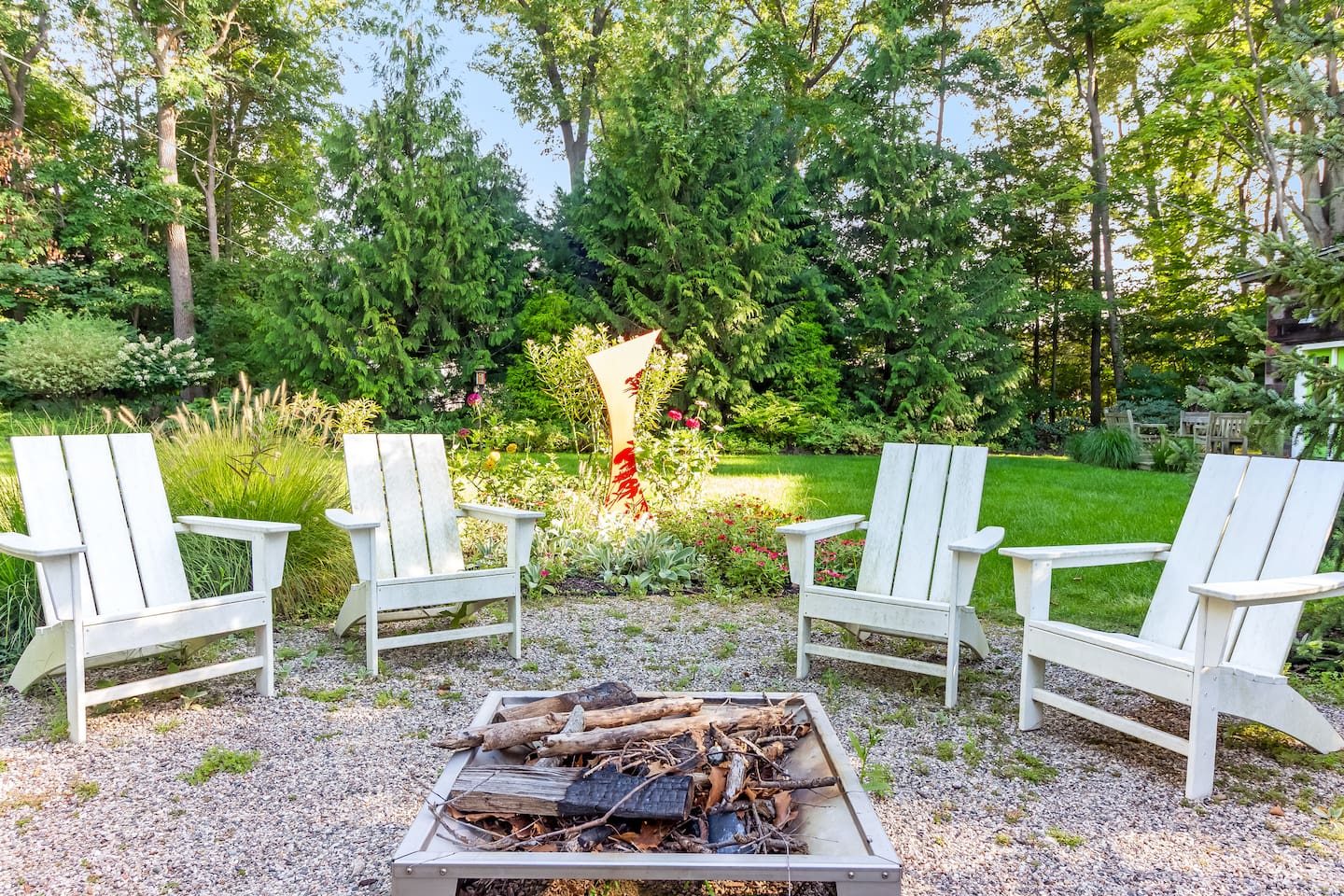 Originally built in 1950 and once home to the renowned Roan & Black art gallery, this inspired upstairs retreat has been reimagined as a two-bedroom, two-bath sanctuary that blends modern design with creative spirit. Step inside to an open, light-filled living area featuring a full kitchen, dining space, and inviting lounge designed for connection and comfort. The thoughtful layout is accented with custom furnishings, curated artwork, and large windows that fill the space with natural light. Both bedrooms offer serene privacy, each styled with plush bedding and artistic touches. The primary suite features a king bed and en-suite bathroom, while the second bedroom includes a queen bed and easy access to a second full bath. A washer and dryer add convenience for longer stays. Outdoors, guests share access to nearly two acres of beautifully landscaped grounds, complete with shaded seating areas, multiple decks, a gas grill, and a fire pit—perfect for morning coffee or evening gatherings beneath the trees. Centrally located on Blue Star Highway, the property is: - Directly across the parking lot from Pennyroyal Café & Provisions - 5-minute walk to The Ivy House - 10-minute walk to downtown Saugatuck shops, galleries, and restaurants - 3-minute drive to downtown Douglas - 8-minute drive to Oval Beach - 10-minute drive to Saugatuck Dunes State Park - 15-minute drive to Fenn Valley Vineyards The property is pet-friendly, we just ask that you please pets off furniture and clean up after them in the yard. We look forward to welcoming you!