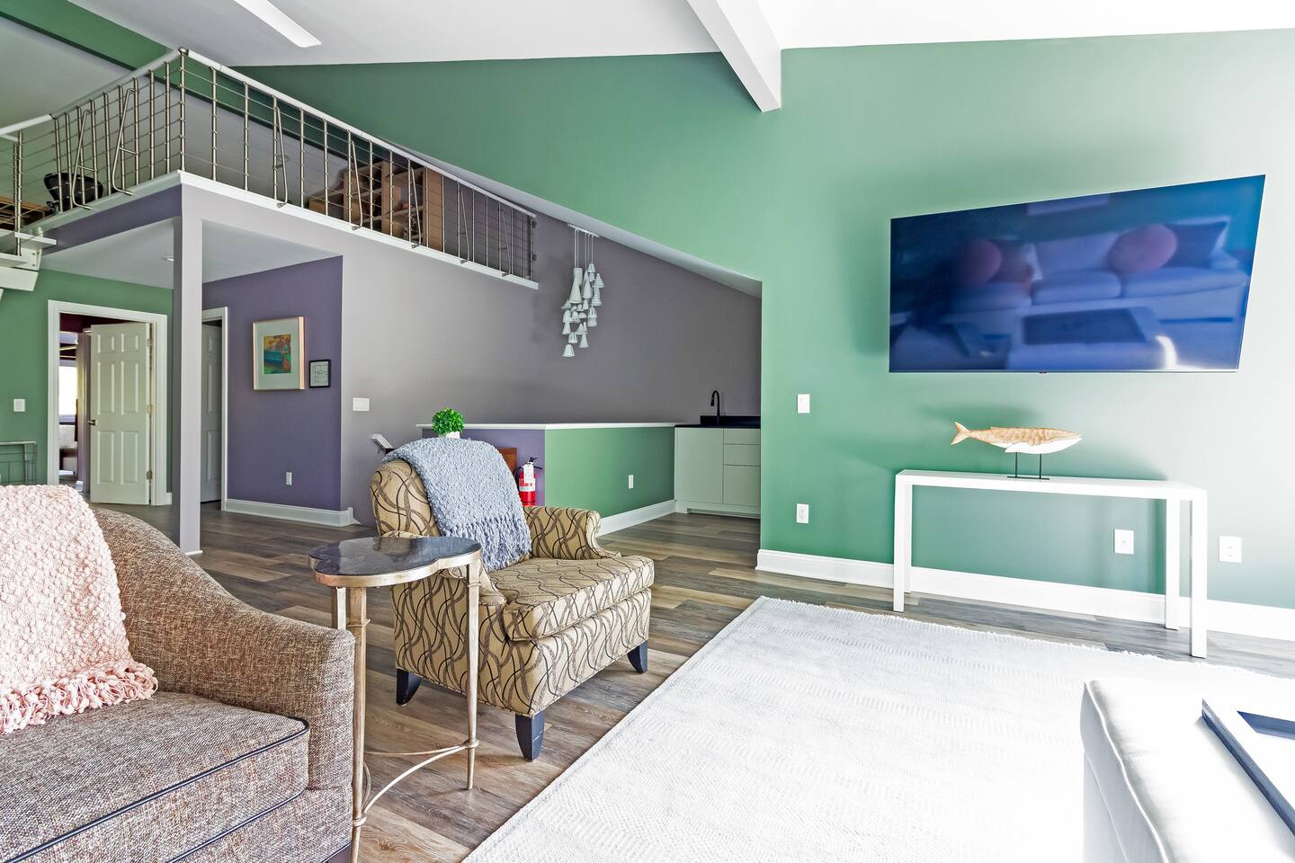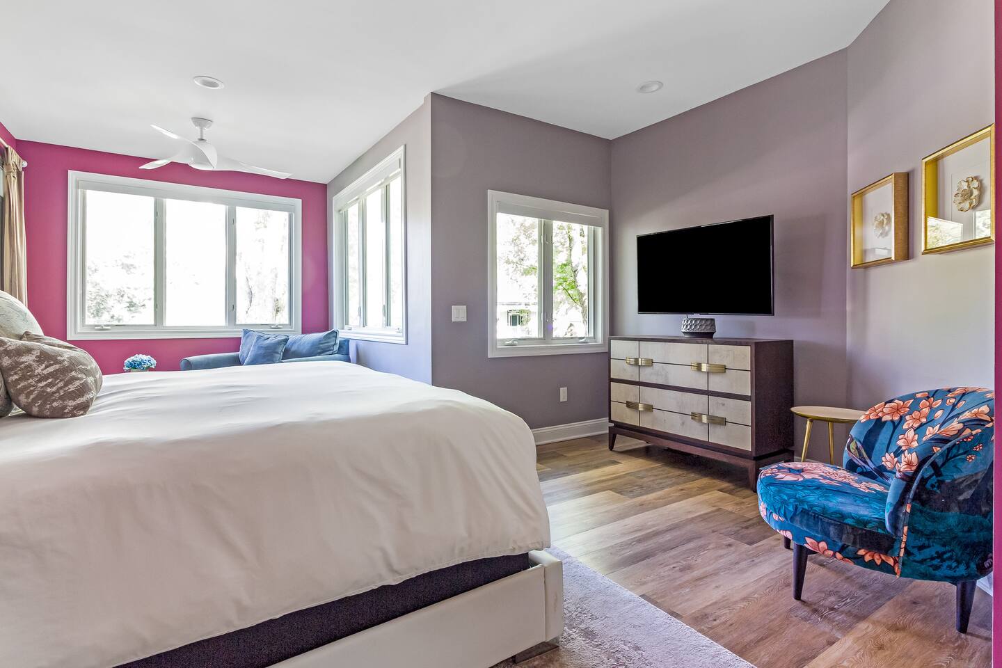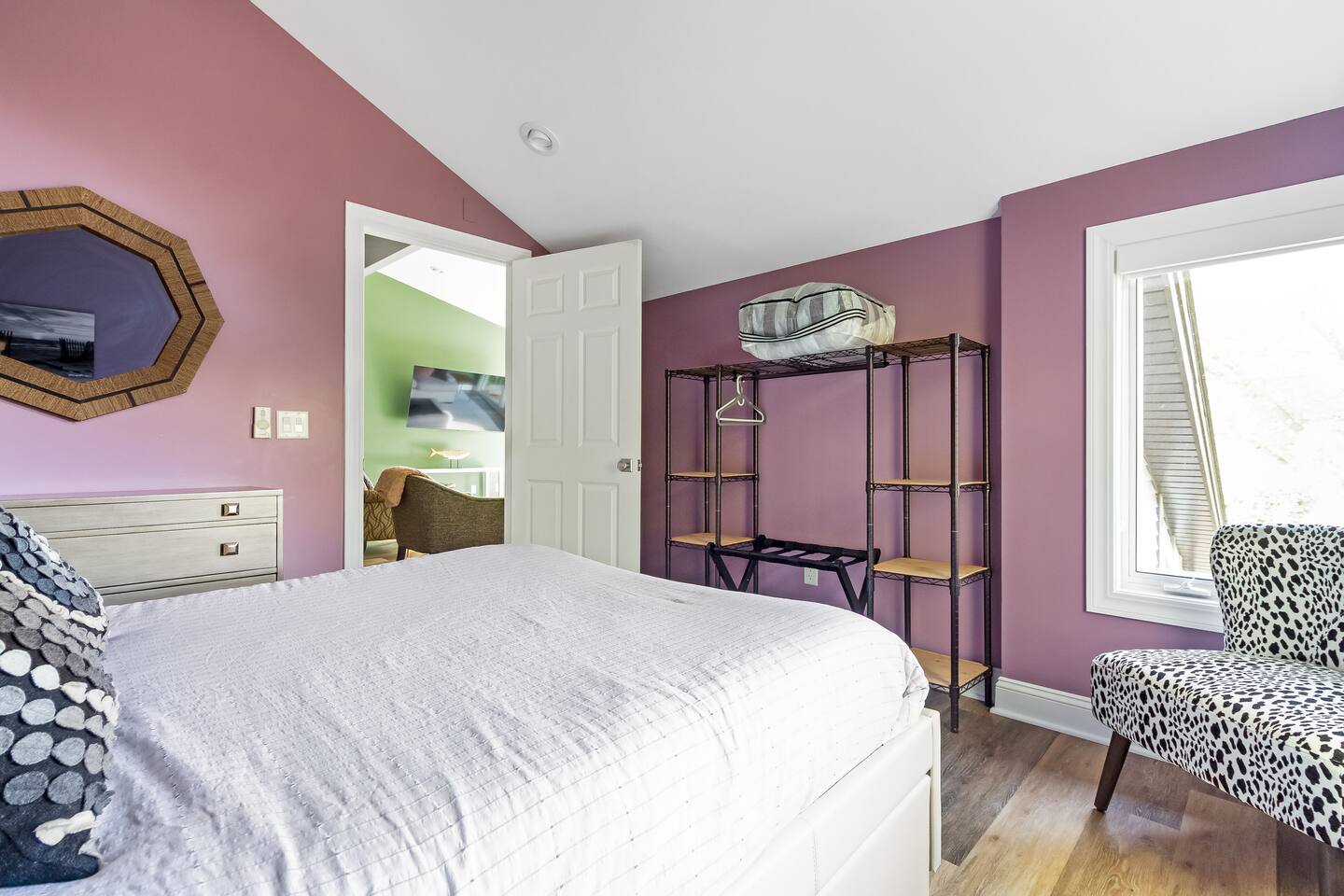 From the moment you arrive at The Hamilton, the experience is all about comfort and connection. Pull into the drive and you’ll find parking for up to four vehicles, making arrival easy for groups traveling together. One vehicle can park in the garage and the other 3 in the driveway. Step inside the main level, where natural light floods the open living, dining, and kitchen area. At the center is an incredibly well-appointed chef’s kitchen, complete with high-end appliances, abundant counter space, and a large island with bar seating—perfect for cooking, entertaining, or simply gathering together. Thoughtfully decorated with original pieces from local artists, the entire space feels both stylish and welcoming. Also on this level is a comfortable king bedroom and full bathroom (both wheelchair accessible) as well as a convenient laundry room. Upstairs, a second living room opens onto a private balcony, with gorgeous views overlooking the lawn and pond. The spacious primary suite features an en-suite bath with soaking tub and walk-in shower, joined by two additional bedrooms and another full bathroom. Above, a cozy loft office offers two workstations overlooking the living room below, perfect for those who need to balance work and play. Head downstairs to discover the home’s wellness and entertainment spaces. A yoga studio and soothing infrared sauna invite relaxation, while the large game room is ready for friendly competition. This level also includes a bedroom with two twin beds, a full bathroom, and a second laundry room stocked with beach gear. Step outside to the spacious back deck, where you’ll find plenty of seating for relaxing and a large dining table for meals under the open sky. Overlooking the lawn and pond, it’s a peaceful spot to sip your morning coffee, gather for an al fresco dinner, or simply unwind and enjoy the sunset. The Hamilton is designed to bring people together while offering plenty of space to spread out—whether you’re here for a family vacation, a retreat with friends, or a special celebration. The property is conveniently located: - a 5 minute walk from the iconic Root Beer Barrel - a half-mile from downtown Douglas - 1 mile from Lake Michigan (Douglas Beach) - 1.5 miles from downtown Saugatuck - less than 2 miles from Oval Beach We look forward to welcoming you at the Hamilton! STR Registration #- CR24-161