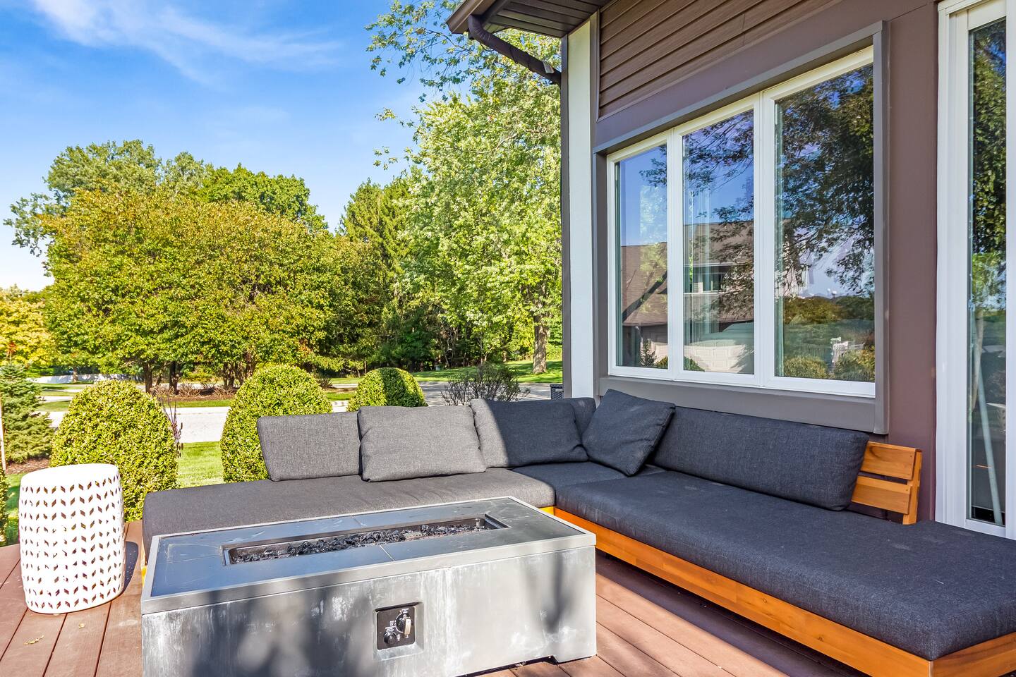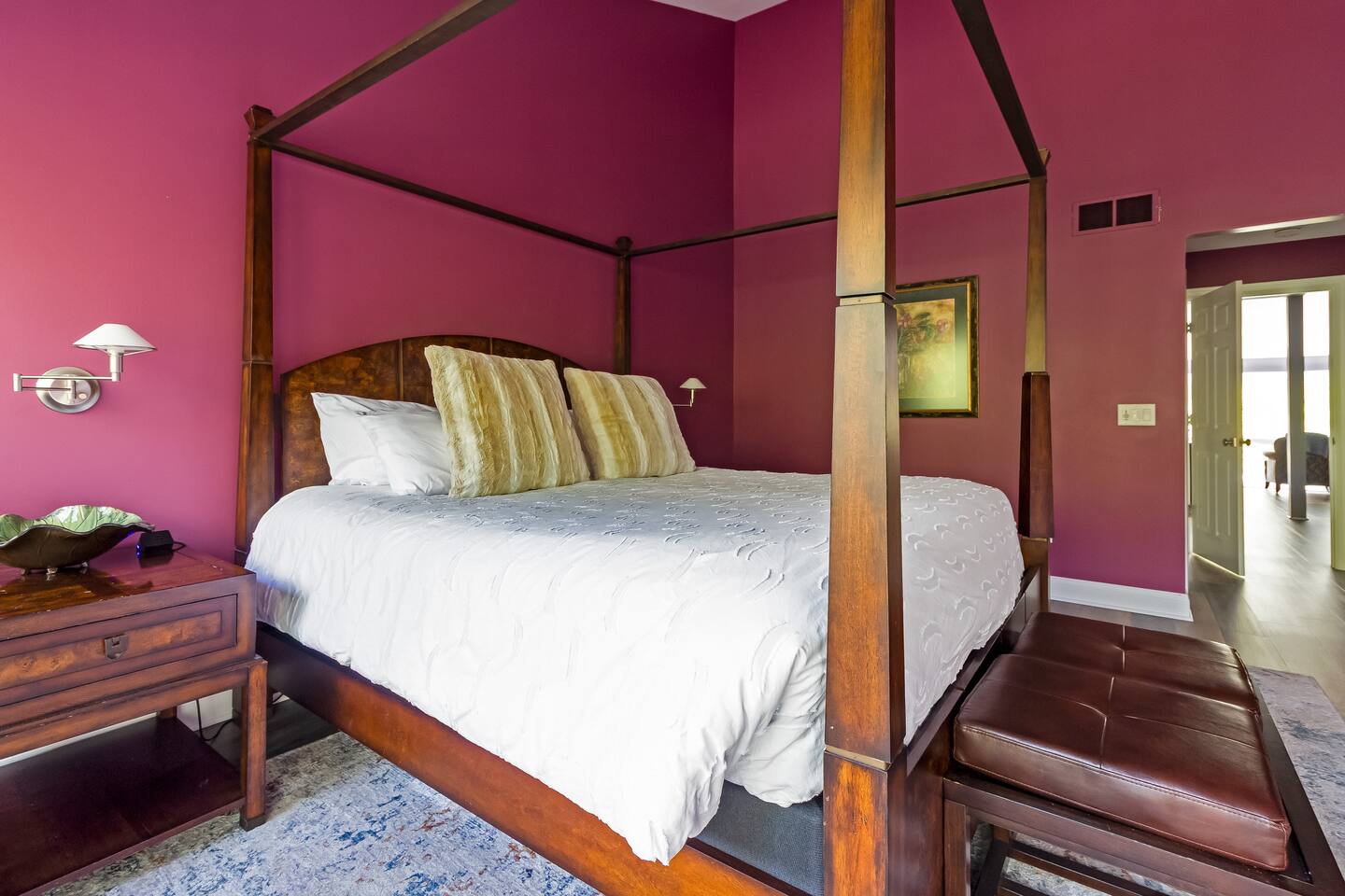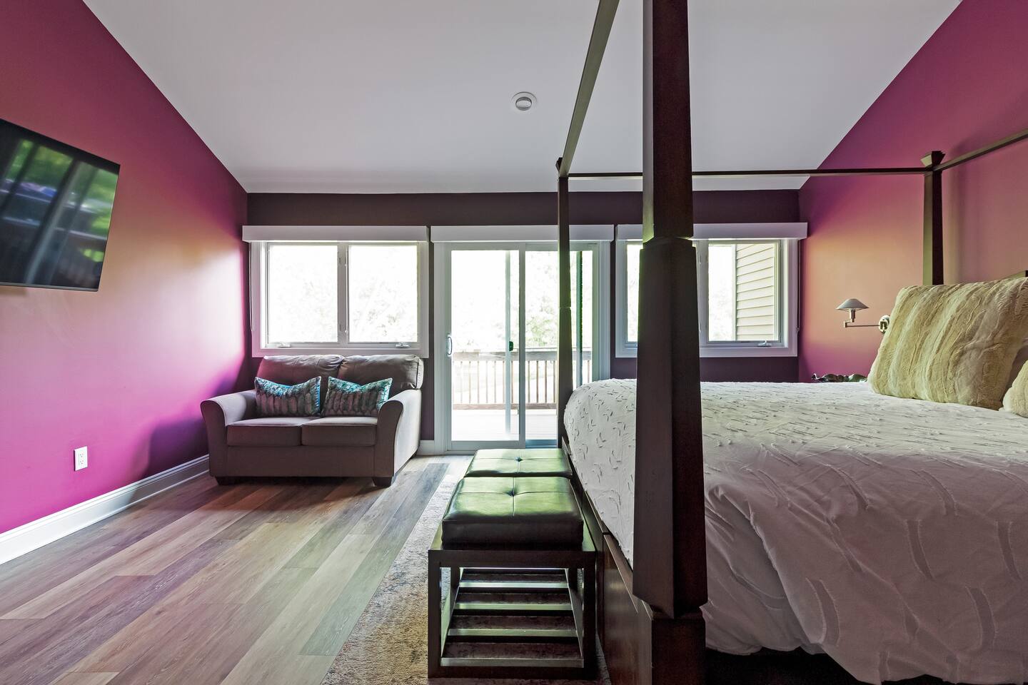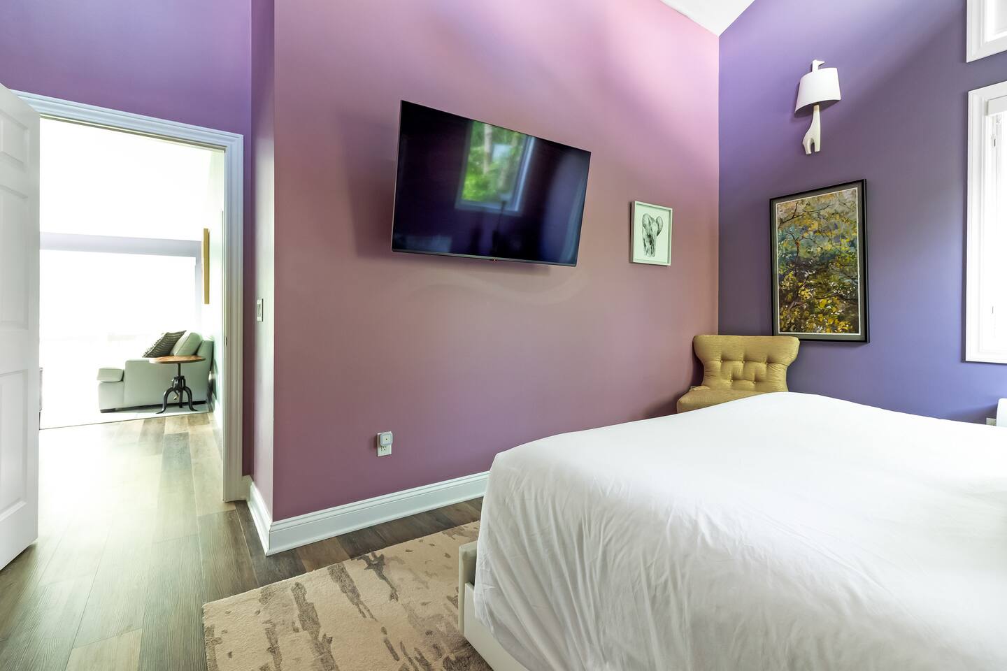 From the moment you arrive at The Hamilton, the experience is all about comfort and connection. Pull into the drive and you’ll find parking for up to four vehicles, making arrival easy for groups traveling together. One vehicle can park in the garage and the other 3 in the driveway. Step inside the main level, where natural light floods the open living, dining, and kitchen area. At the center is an incredibly well-appointed chef’s kitchen, complete with high-end appliances, abundant counter space, and a large island with bar seating—perfect for cooking, entertaining, or simply gathering together. Thoughtfully decorated with original pieces from local artists, the entire space feels both stylish and welcoming. Also on this level is a comfortable king bedroom and full bathroom (both wheelchair accessible) as well as a convenient laundry room. Upstairs, a second living room opens onto a private balcony, with gorgeous views overlooking the lawn and pond. The spacious primary suite features an en-suite bath with soaking tub and walk-in shower, joined by two additional bedrooms and another full bathroom. Above, a cozy loft office offers two workstations overlooking the living room below, perfect for those who need to balance work and play. Head downstairs to discover the home’s wellness and entertainment spaces. A yoga studio and soothing infrared sauna invite relaxation, while the large game room is ready for friendly competition. This level also includes a bedroom with two twin beds, a full bathroom, and a second laundry room stocked with beach gear. Step outside to the spacious back deck, where you’ll find plenty of seating for relaxing and a large dining table for meals under the open sky. Overlooking the lawn and pond, it’s a peaceful spot to sip your morning coffee, gather for an al fresco dinner, or simply unwind and enjoy the sunset. The Hamilton is designed to bring people together while offering plenty of space to spread out—whether you’re here for a family vacation, a retreat with friends, or a special celebration. The property is conveniently located: - a 5 minute walk from the iconic Root Beer Barrel - a half-mile from downtown Douglas - 1 mile from Lake Michigan (Douglas Beach) - 1.5 miles from downtown Saugatuck - less than 2 miles from Oval Beach We look forward to welcoming you at the Hamilton! STR Registration #- CR24-161