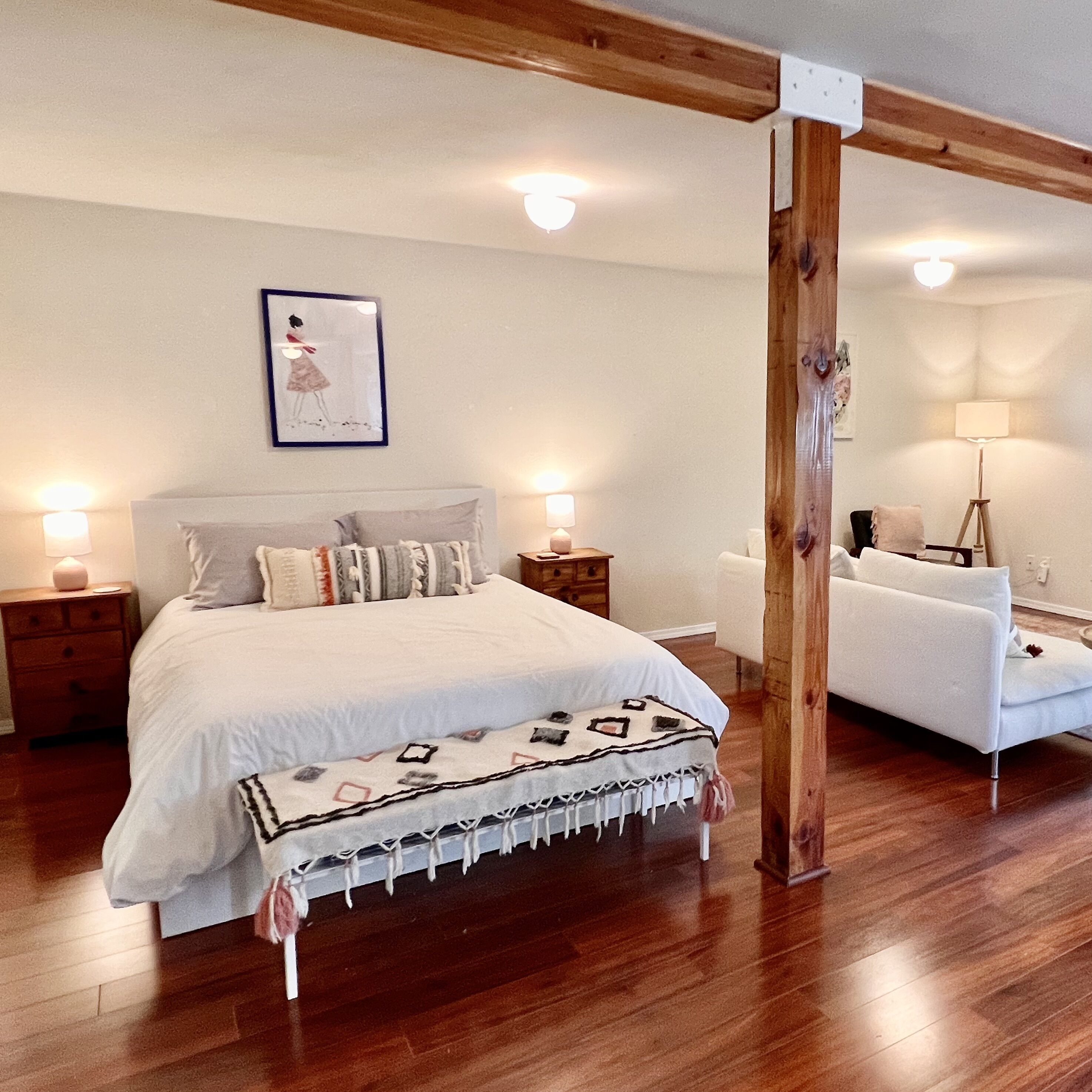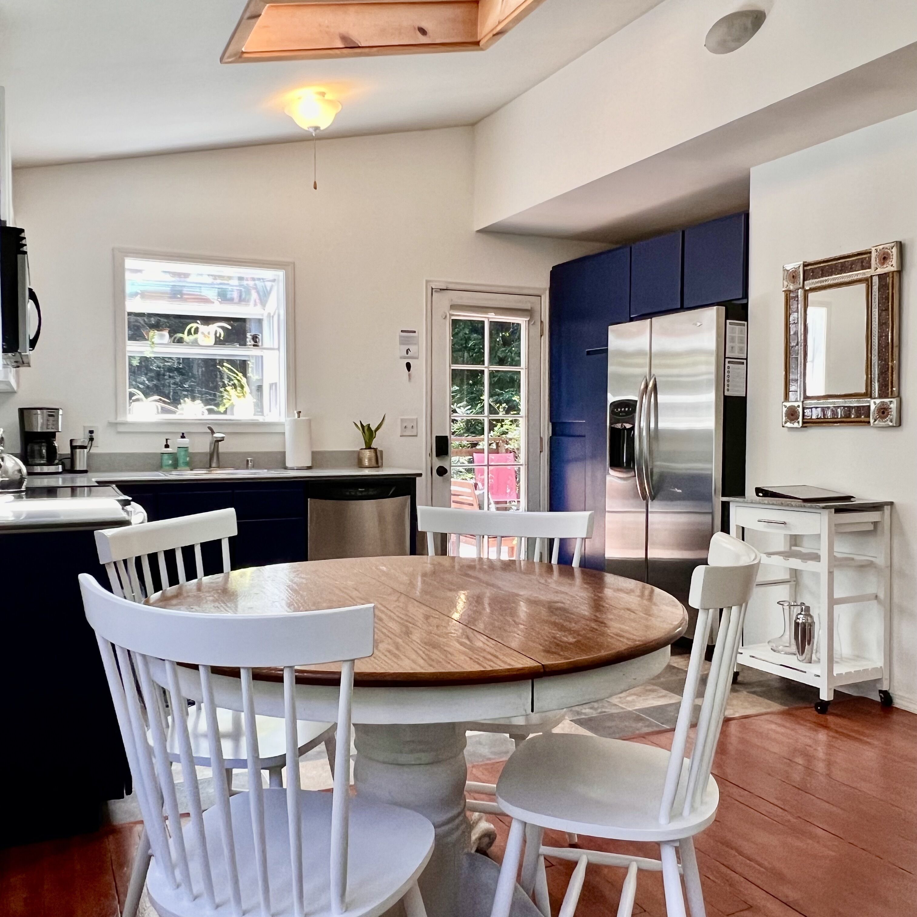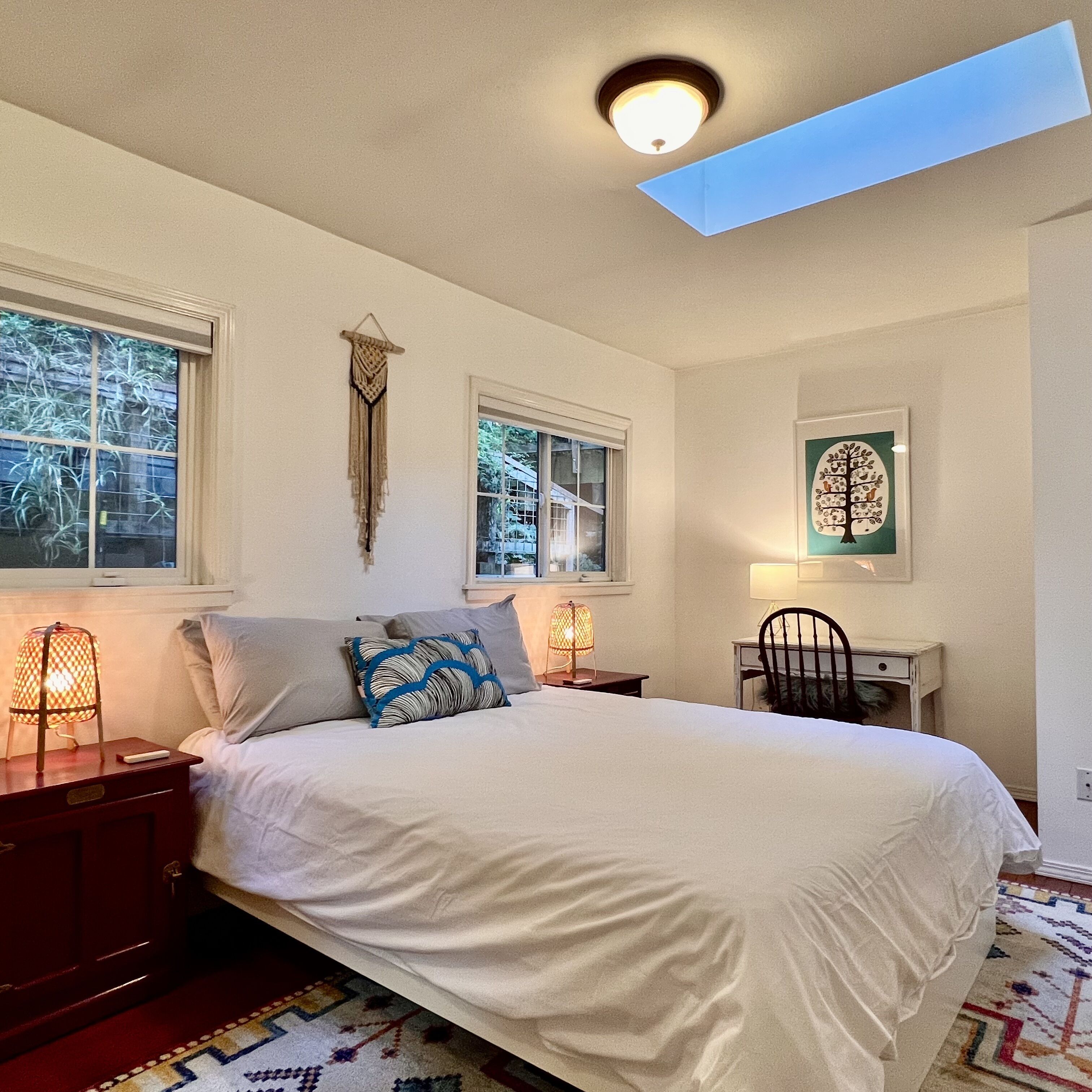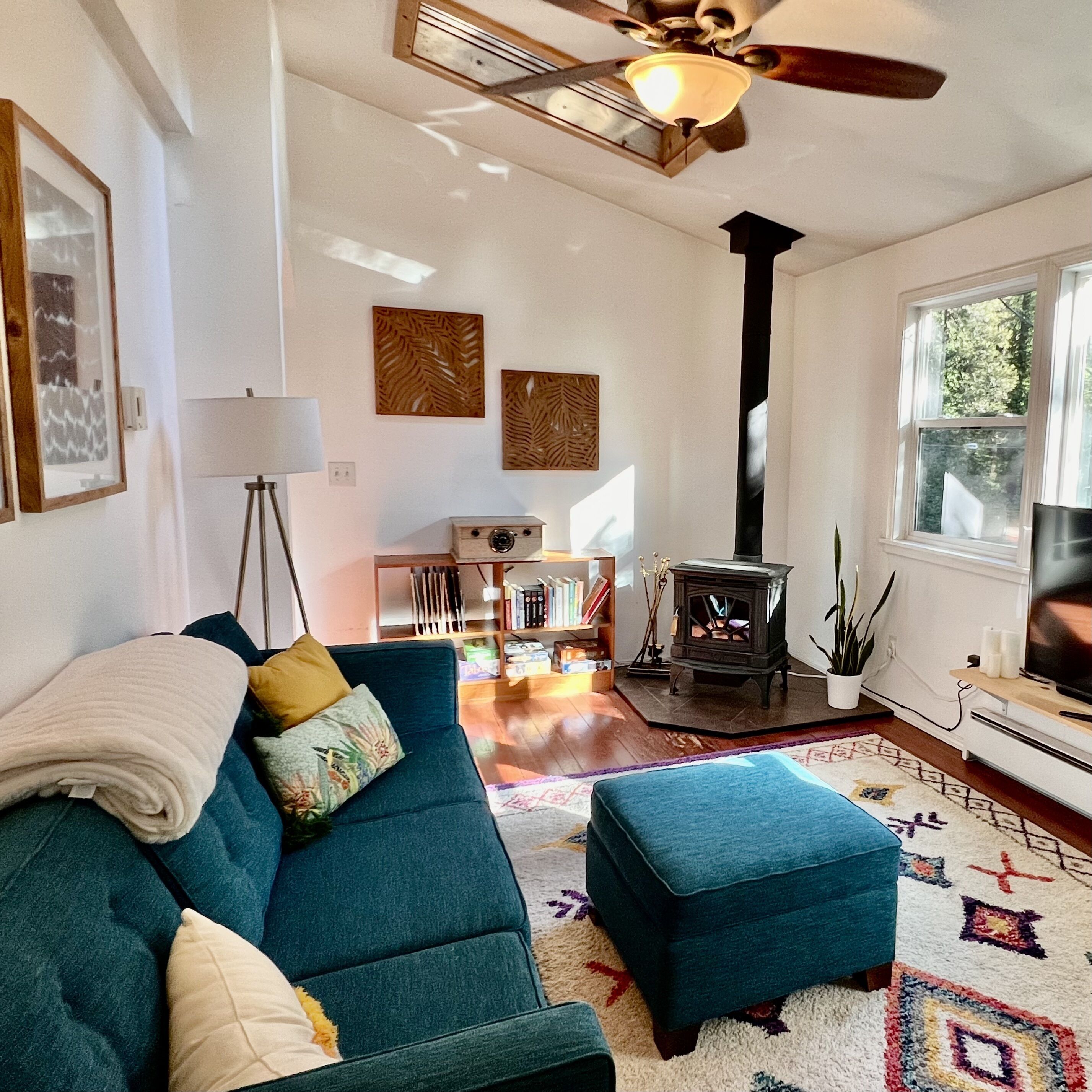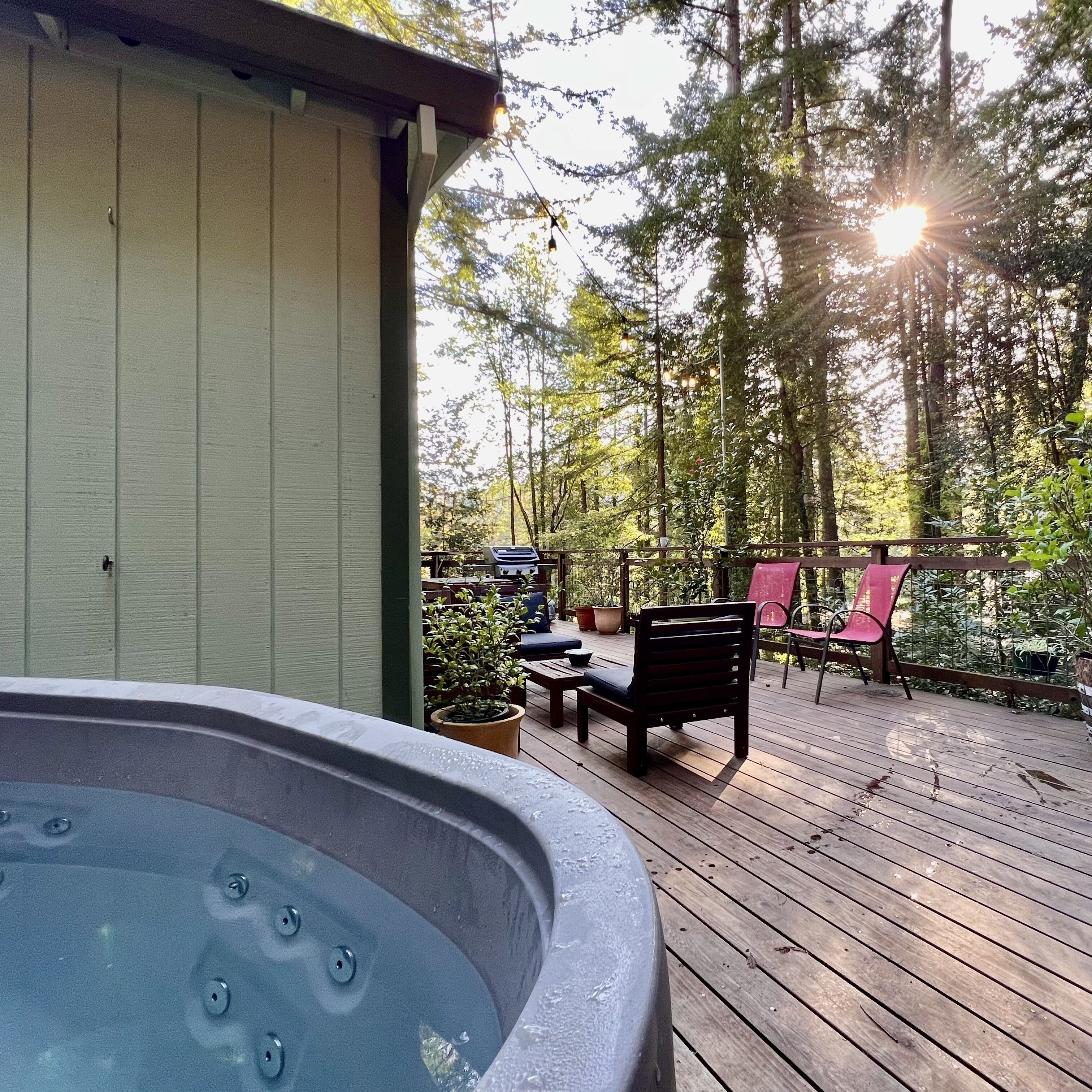 Once you arrive, you'll first step down onto our beautiful deck, with plentiful lounge seating, a dining table with benches and a gas grill. Relax under the cafe lights while you prepare your dinner or soak in the hot tub just steps away! Inside on the top floor, you'll step into a recently-renovated kitchen, fully-equipped with everything you need to cook up your favorite meals. We provide coffee and tea, as well as cooking basics like olive oil, salt & pepper. On the upper level, you'll also find a bedroom and a full bathroom. The bedroom has a Queen bed as well as a desk. The large bathroom is stocked with plush towels and luxury toiletries for your stay. All rooms on the upper level have large windows and skylights, which bring in an abundance of natural light throughout. Next to the kitchen you'll find the living room with a wood-burning stove. Cozy up on the comfortable sofa to read a book, watch movies, listen to records, or play games with friends! The sofa turns into a bed if you need extra sleeping space. The downstairs level is accessed by a separate entrance from the exterior. You'll step into a large open room with a sleeping area, a second living area, desk for working and seating area. Off this room is a full bathroom and the laundry room. Separated from the rest of the house, you can retreat downstairs to your own private suite! If you leave the property during your stay, there are so many restaurants and activities within minutes from the house. We provide floats and other river toys if you venture to the river. We also provide recommendations of our favorite places to check out during your visit. We hope you choose to stay with us! PLEASE NOTE: This property is in a residential neighborhood with quiet hours between 10pm and 8am. We ask that you please keep outside voices to a whisper and have no amplified music playing during that time. Sonoma County permit number: TVR21-0189 Sonoma County tax number: 3711N