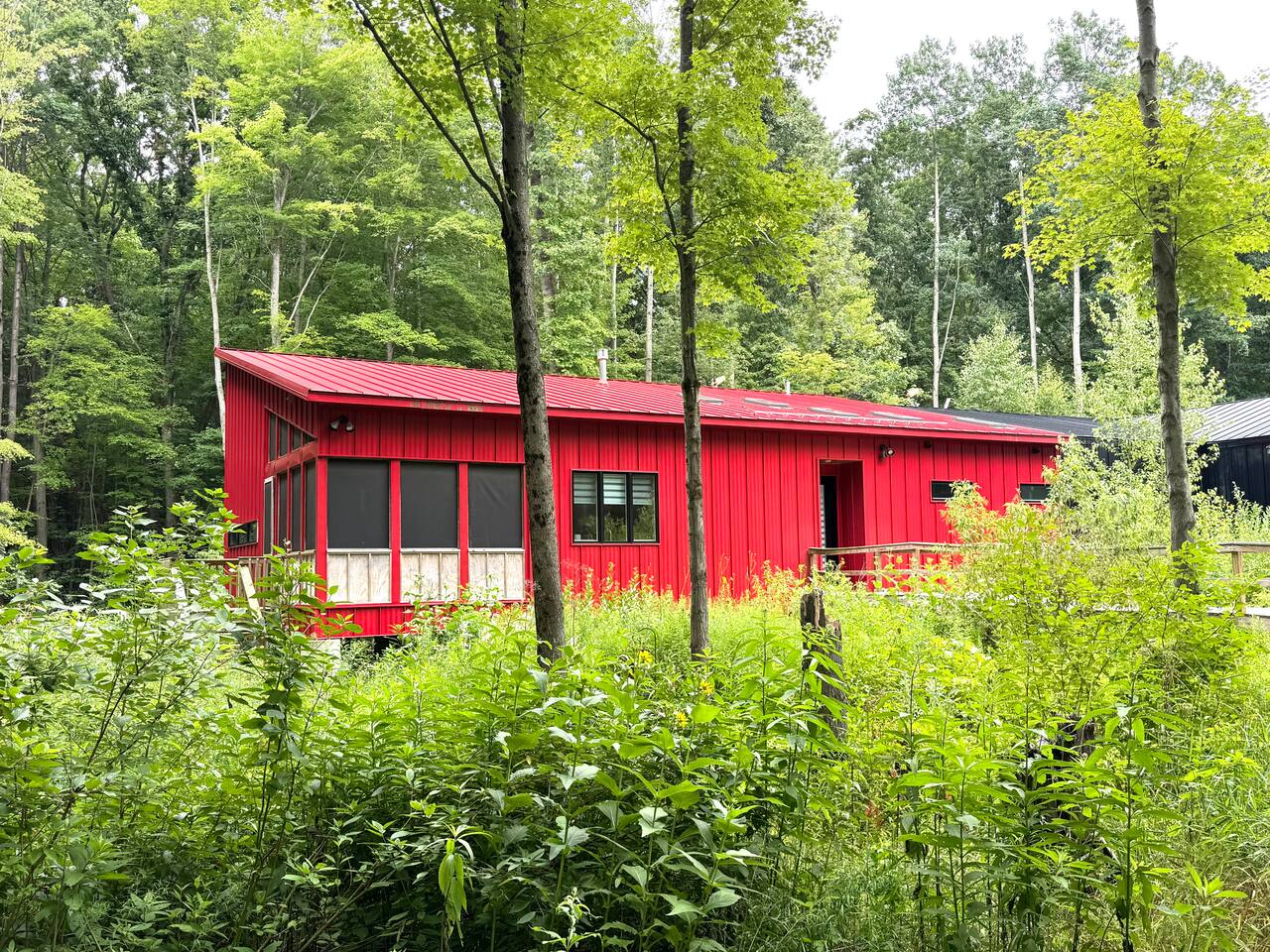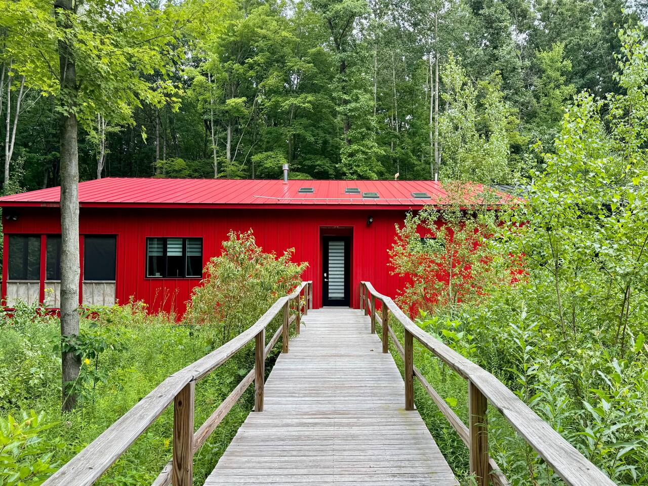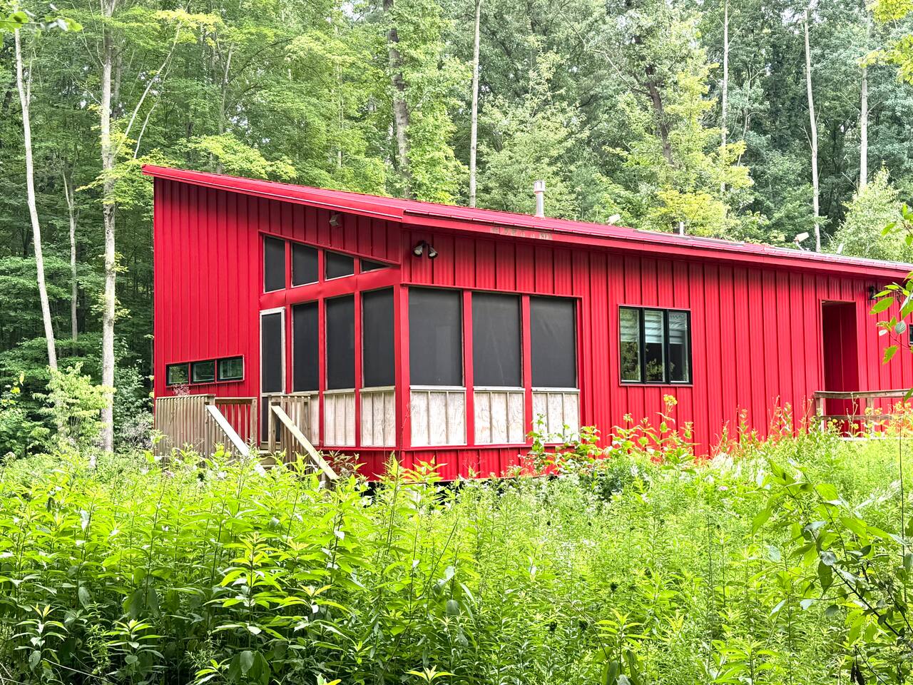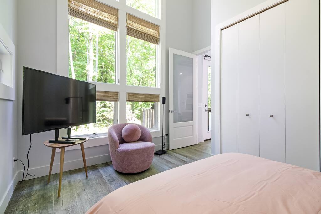 Tucked away on nearly 5 acres, this luxury retreat blends modern architecture with wild, natural surroundings. Soaring ceilings, high-end finishes, and a cozy fireplace create a peaceful, design-forward space. Enjoy two spacious bedrooms, a screened porch, and a private patio with gas grill. Just 15 minutes to Saugatuck and 8 to Fennville, it's the perfect escape—secluded yet close to everything. Ideal for couples or small groups seeking privacy and style. Incredible fall & winter destination!